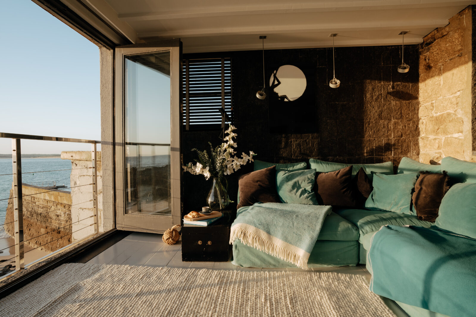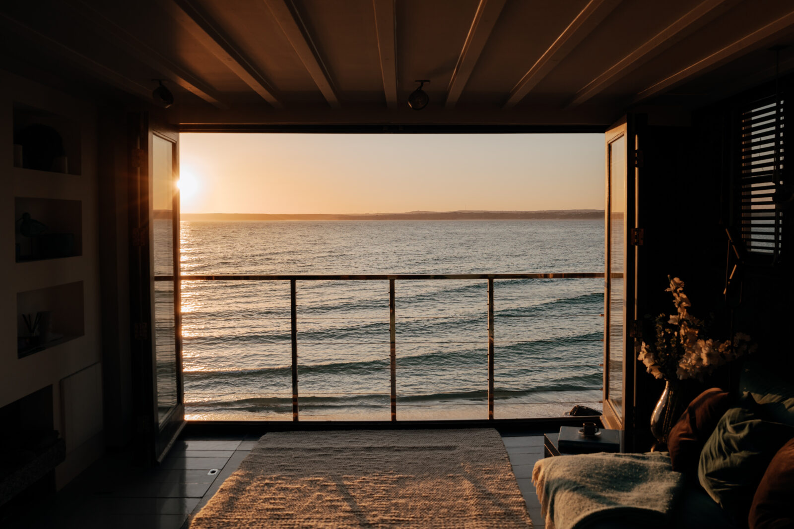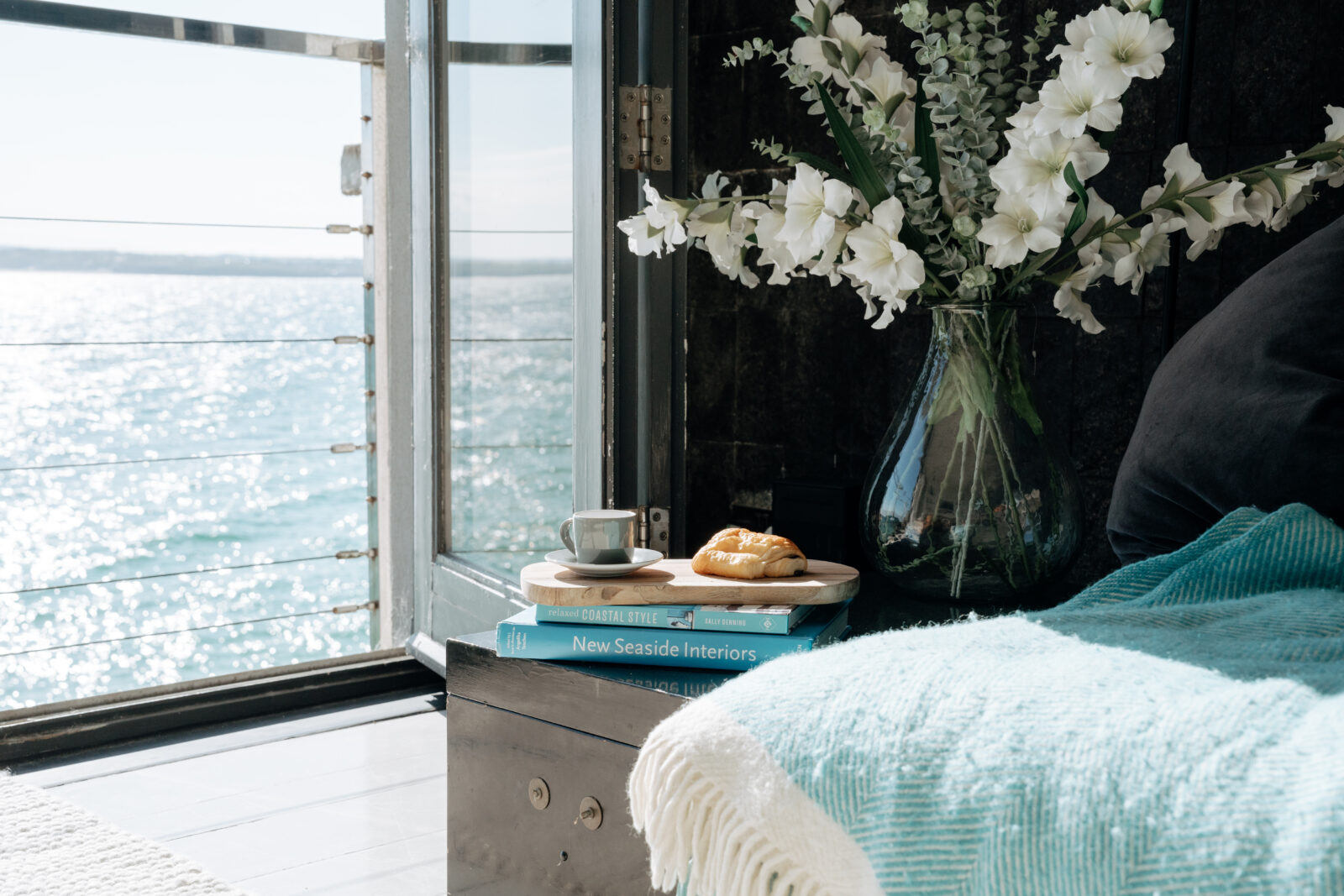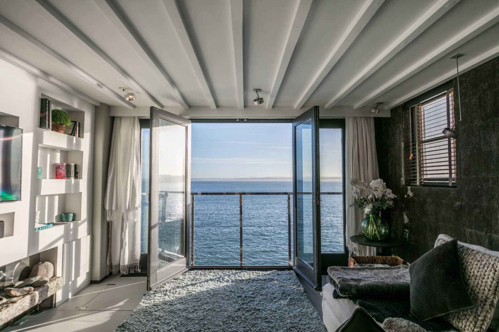 The apartment has an open-plan kitchen and living room that look toward floor-to-ceiling glass doors opening onto a majestic view of St Ives bay. The water is so close that at high tide, it crashes against the side of the apartment, creating the same drama as being on a boat.
