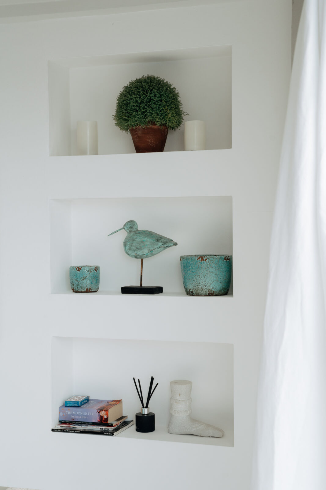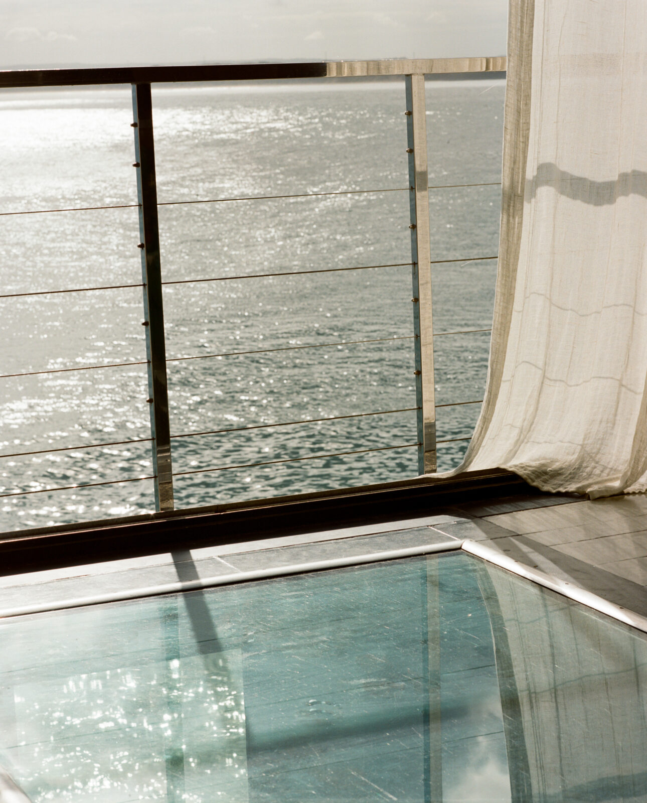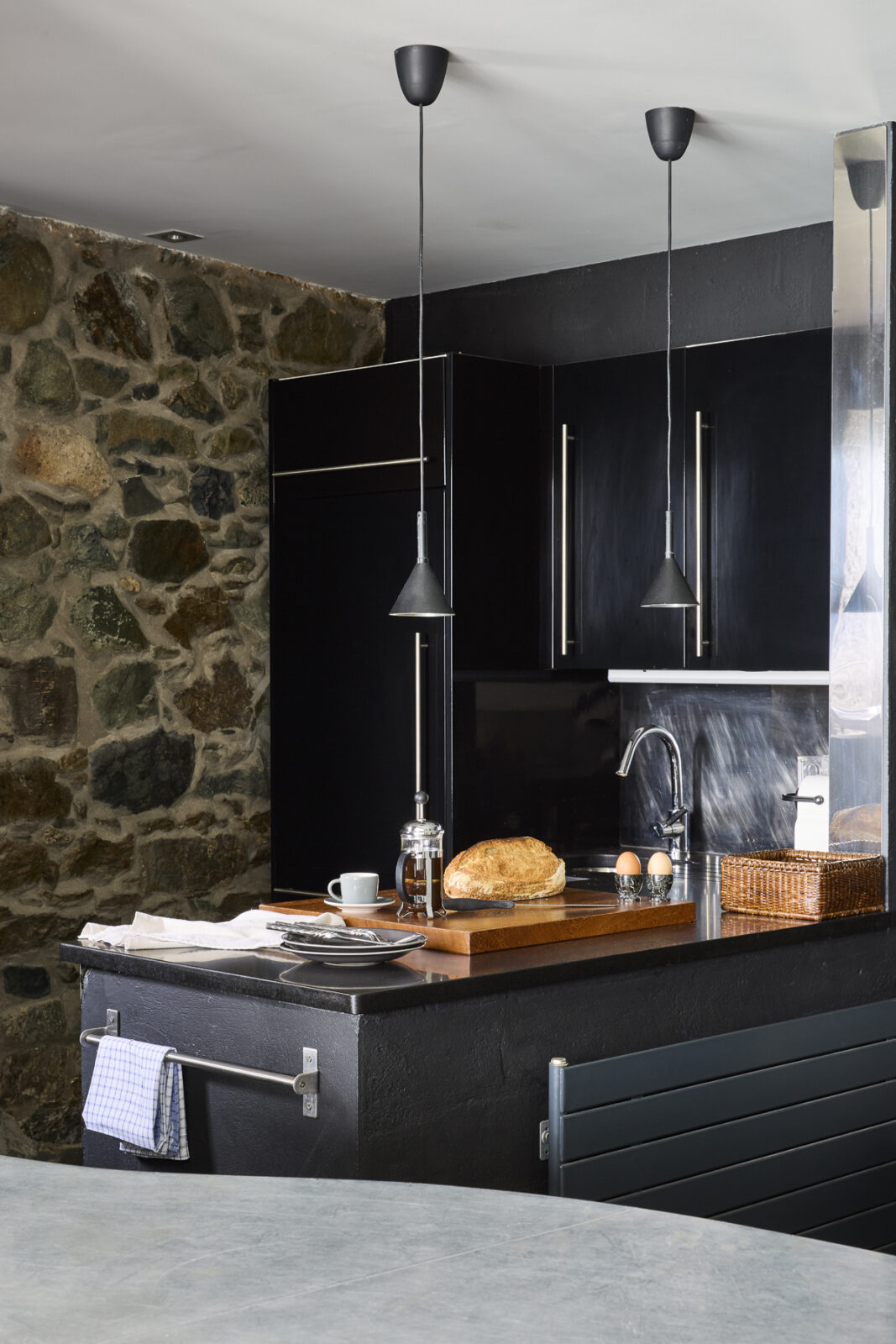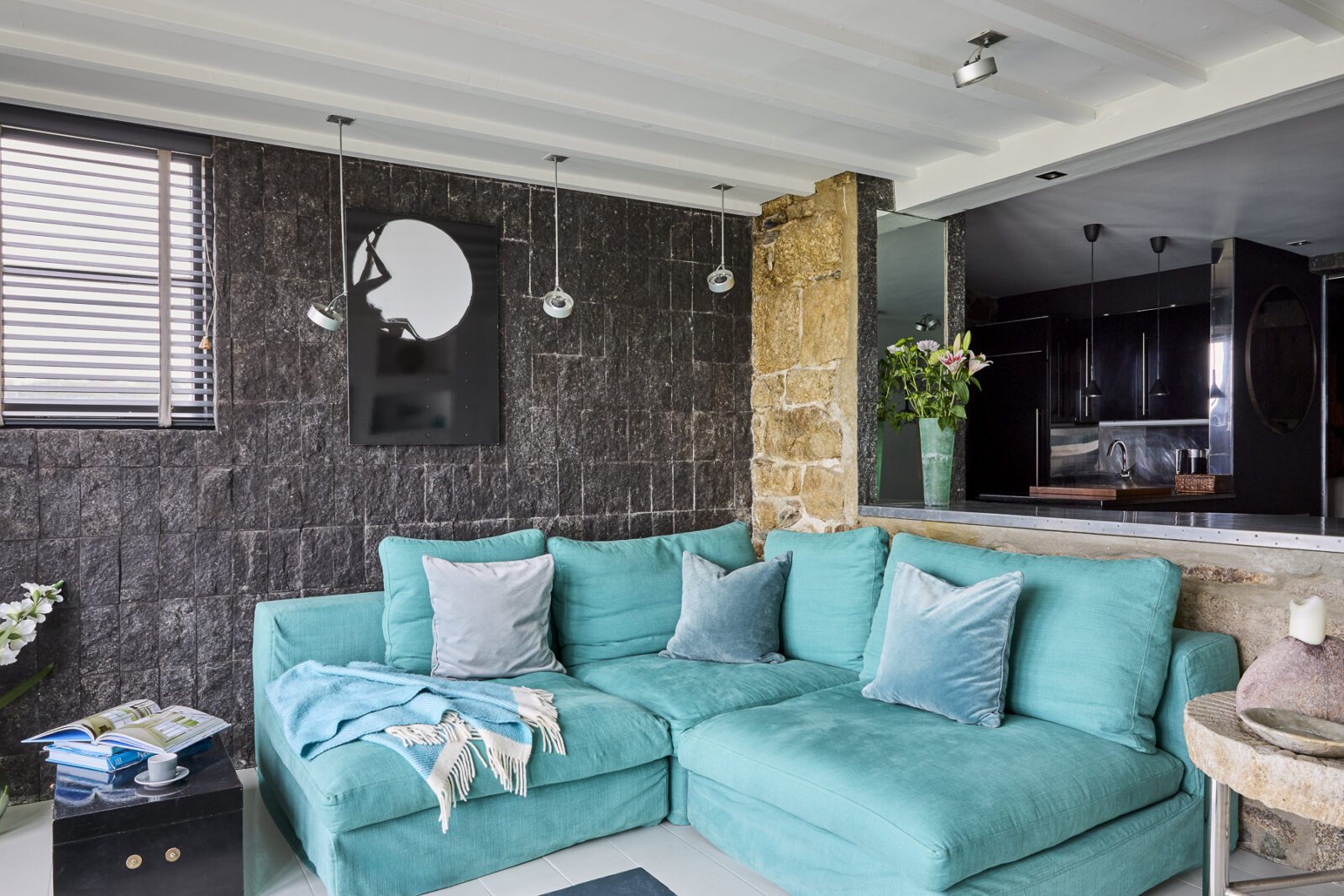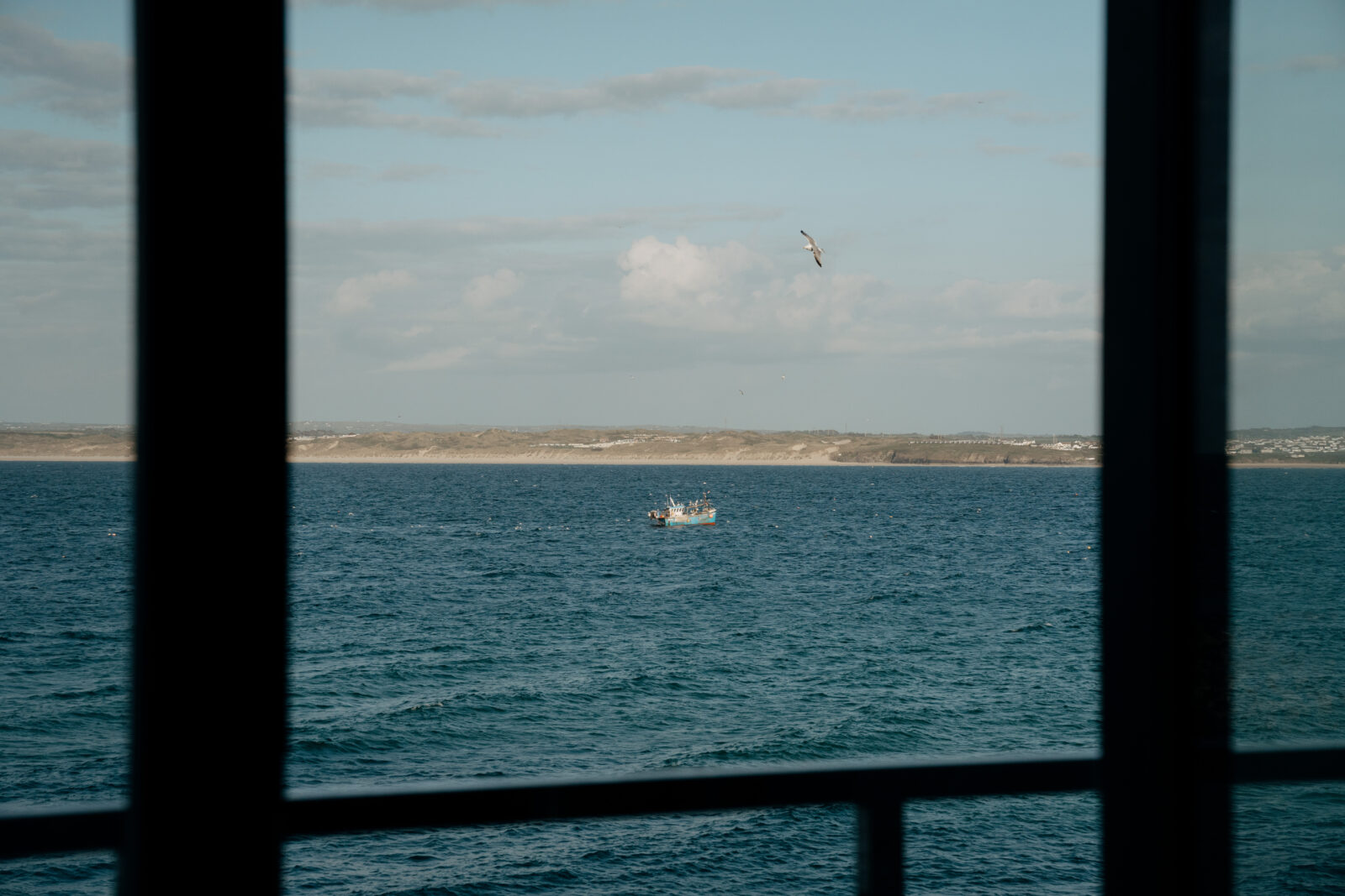 The apartment has an open-plan kitchen and living room that look toward floor-to-ceiling glass doors opening onto a majestic view of St Ives bay. The water is so close that at high tide, it crashes against the side of the apartment, creating the same drama as being on a boat.