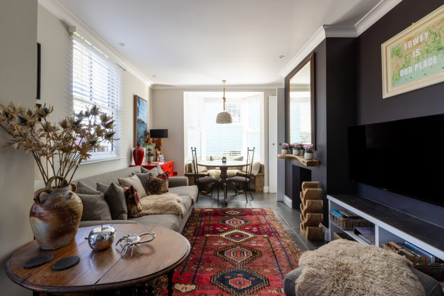 There’s a fully equipped kitchen with a stone-topped breakfast bar and open-plan living space filled with characterful nooks. Settle down in front the fire or take a seat at the circular dining table in the bay window and enjoy views across the roof tops of Fowey, the church and down to the estuary.