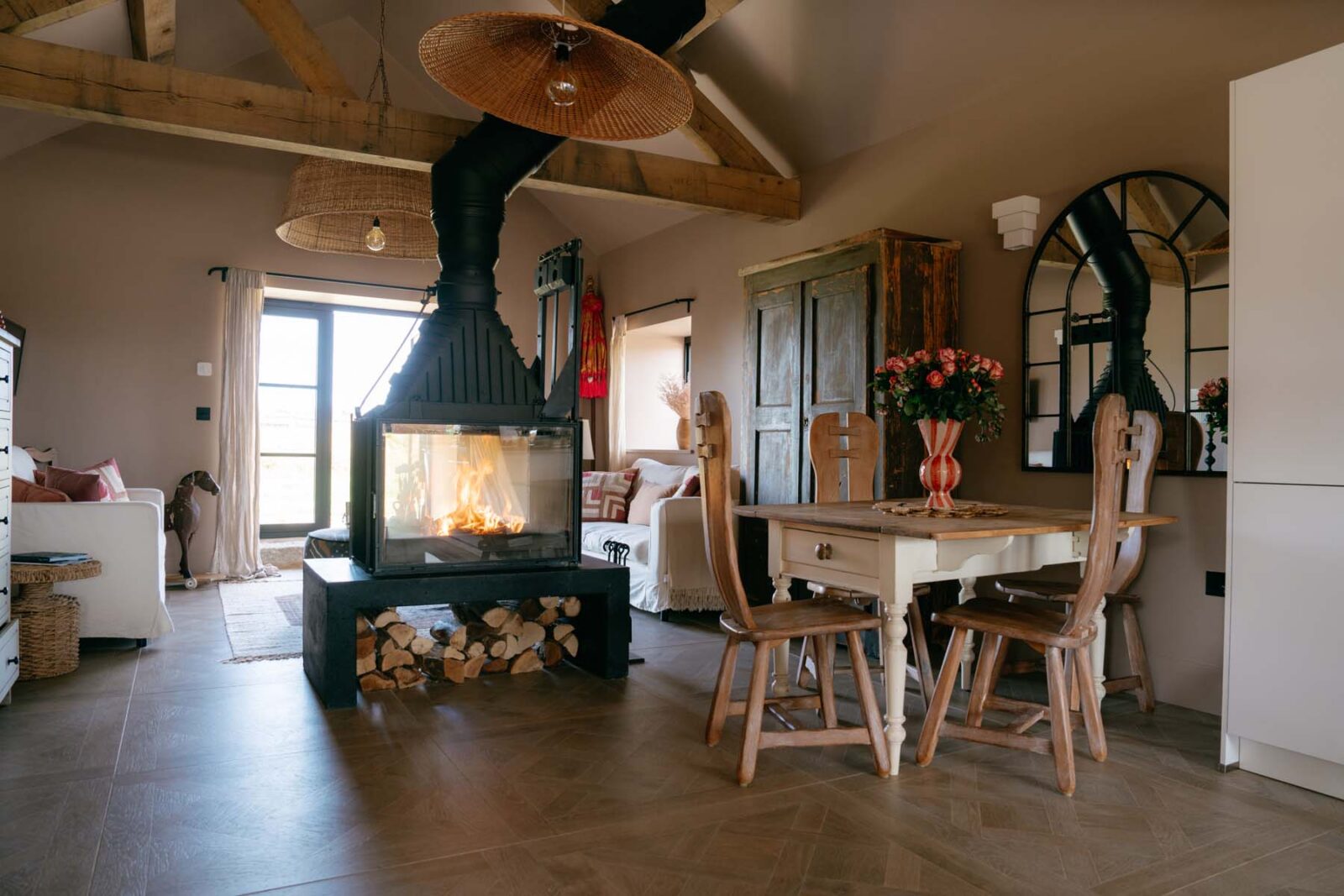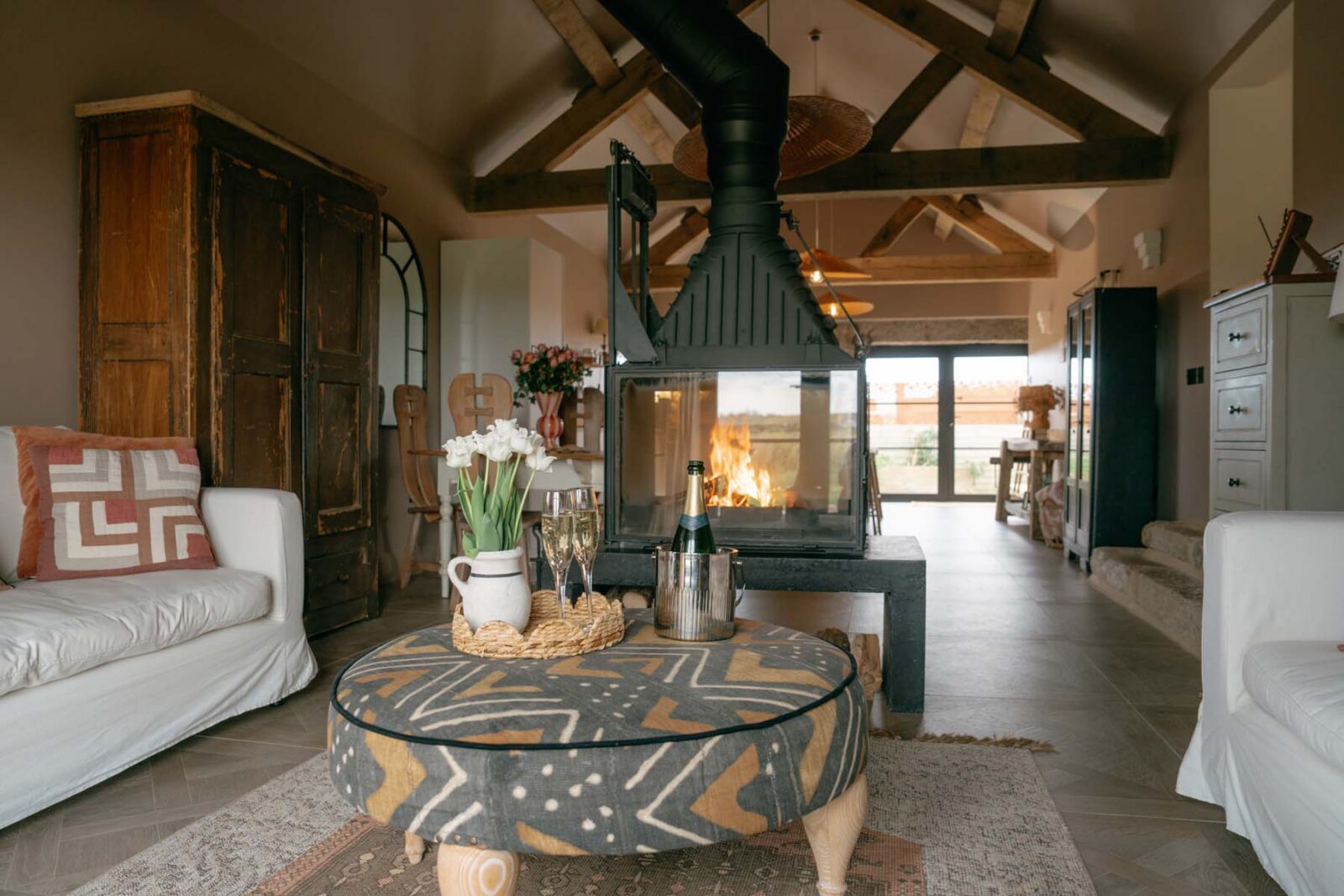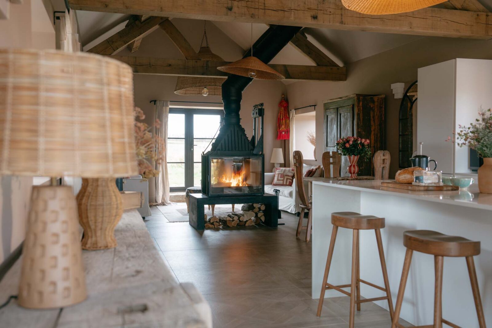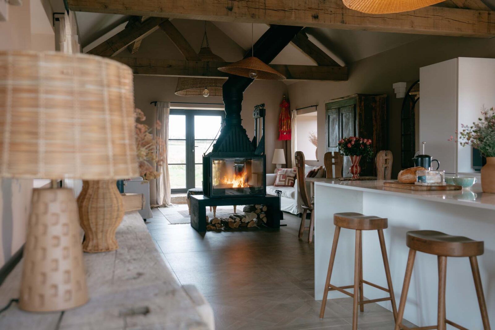 Industrial-style windows draw in the light, while the modern, fully equipped kitchen – complete with high-quality appliances and a central island – is made for slow mornings over coffee and pastries. There’s a small dining set up as well as a cosy sitting area with two sofas centred around a statement log burner. In colder months, you can expect solar-powered underfloor heating throughout.