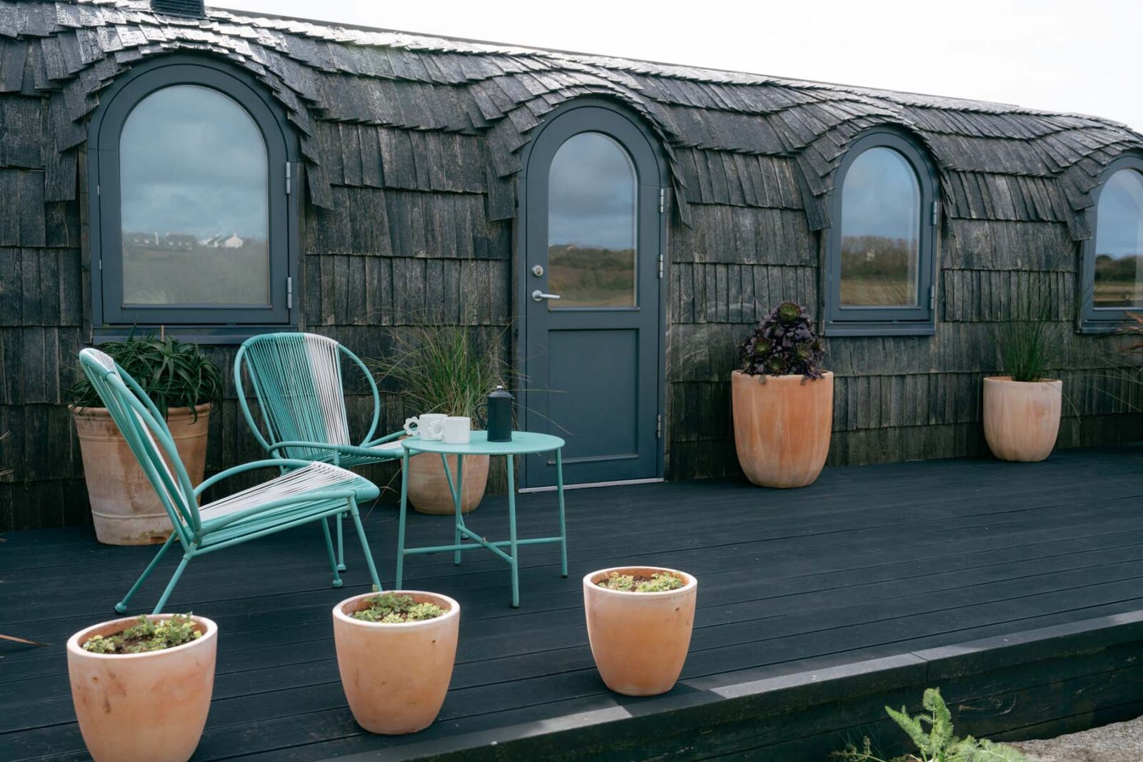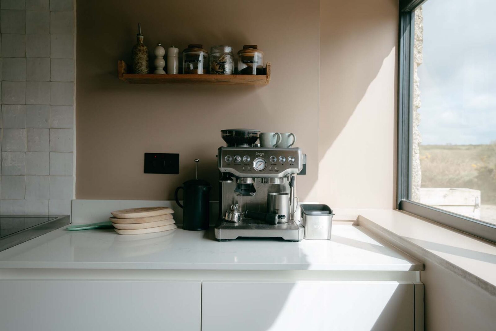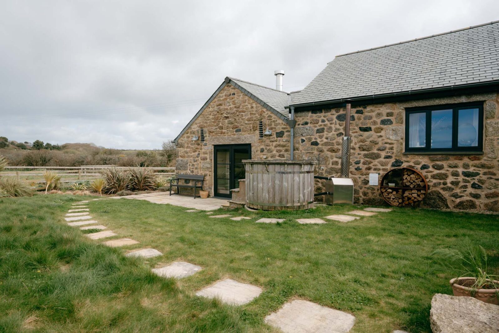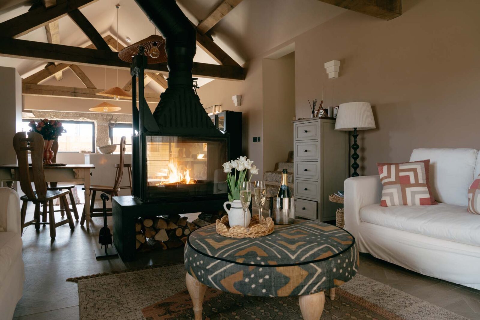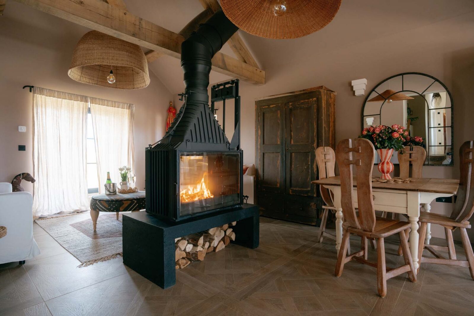 Industrial-style windows draw in the light, while the modern, fully equipped kitchen – complete with high-quality appliances and a central island – is made for slow mornings over coffee and pastries. There’s a small dining set up as well as a cosy sitting area with two sofas centred around a statement log burner. In colder months, you can expect solar-powered underfloor heating throughout.