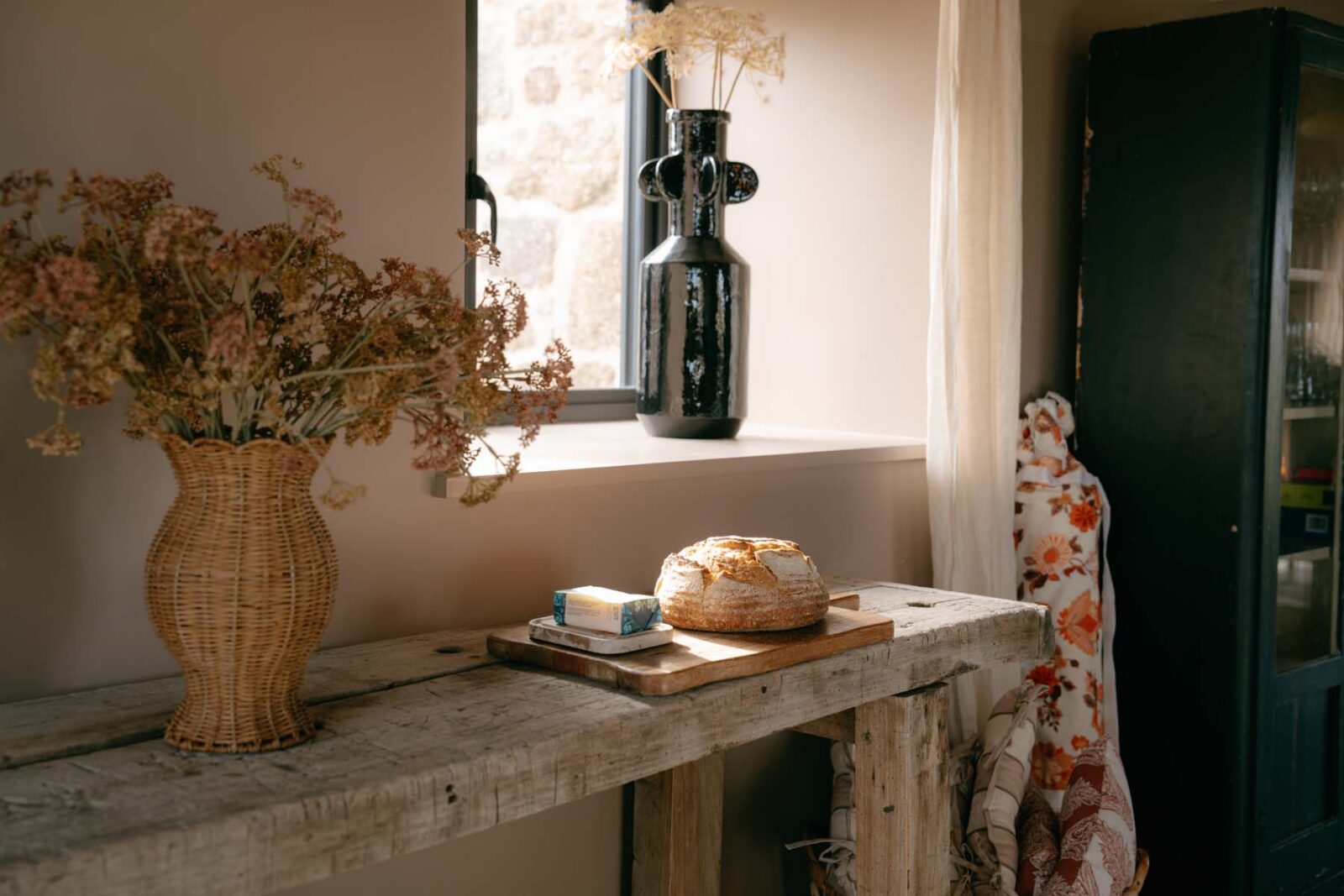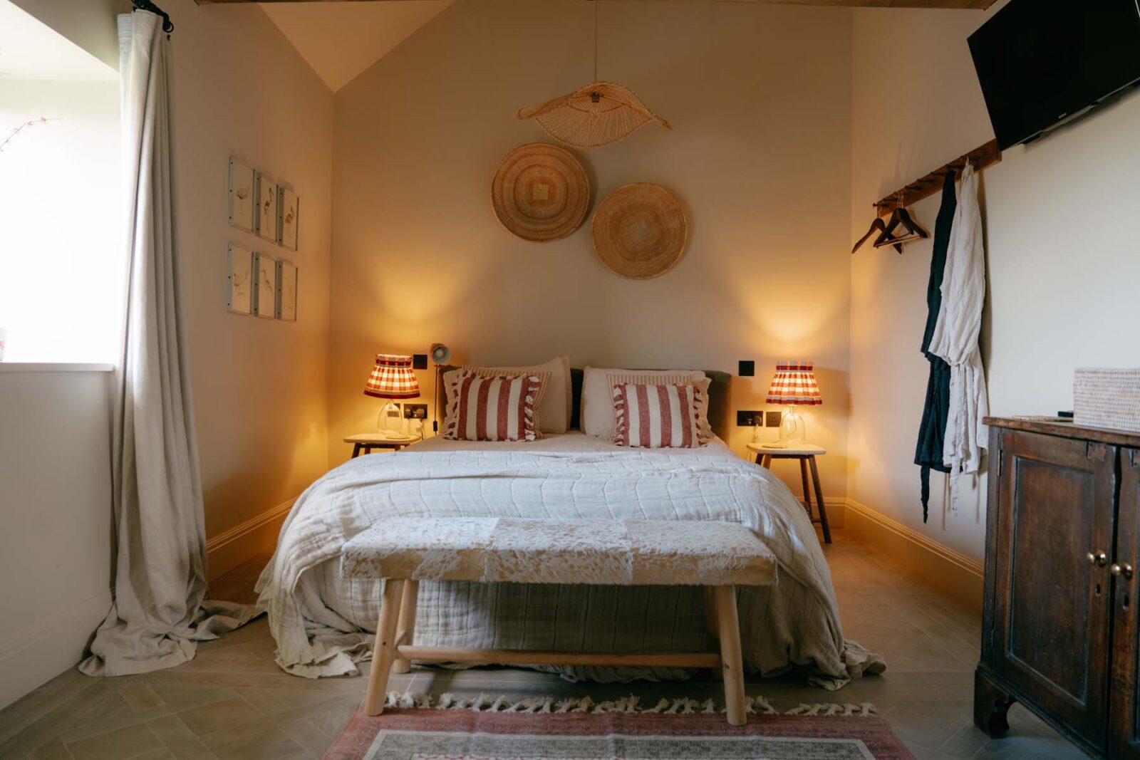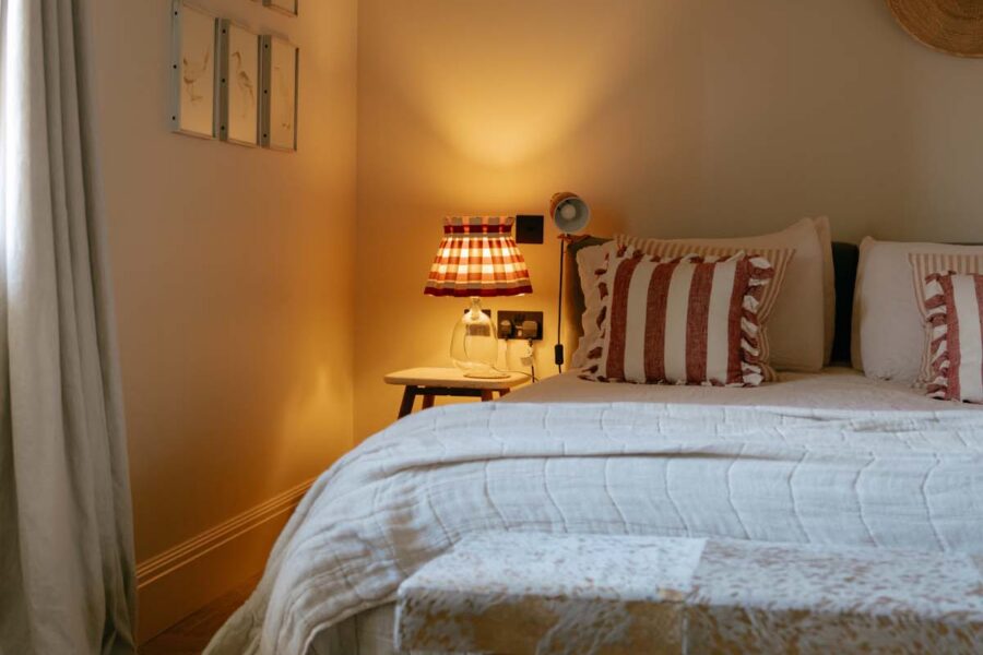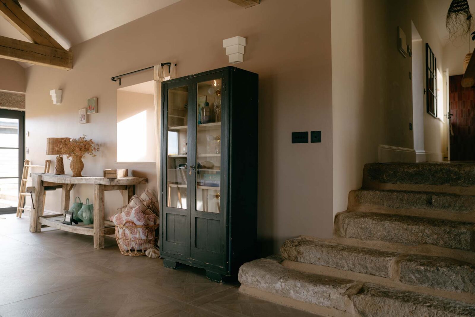 Once a working barn, where horses and carts stood ready for the surrounding fields, The Carthouse now unfolds as a thoughtful balance of old and new. The open-plan living space is grounded by original granite walls and exposed wooden cross beams, alongside softer nods to its coastal location including rattan pendant shades and textured jute rugs.