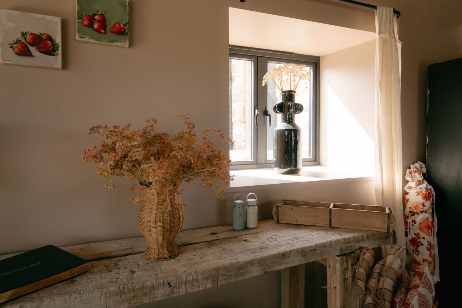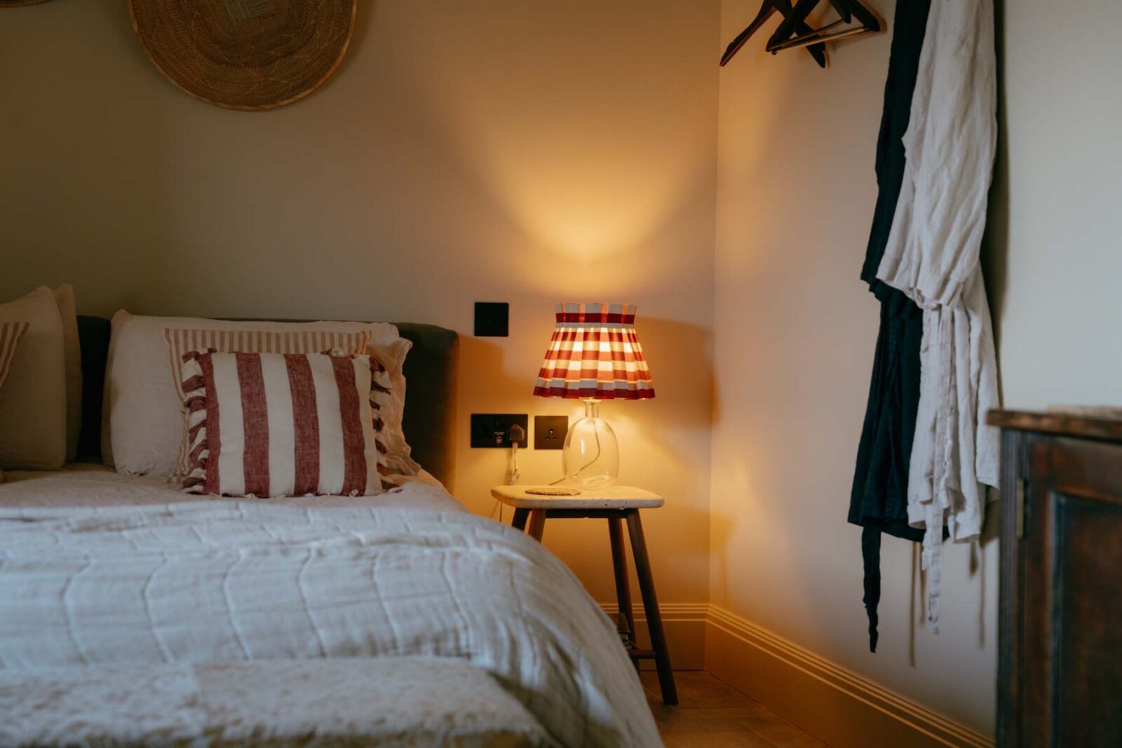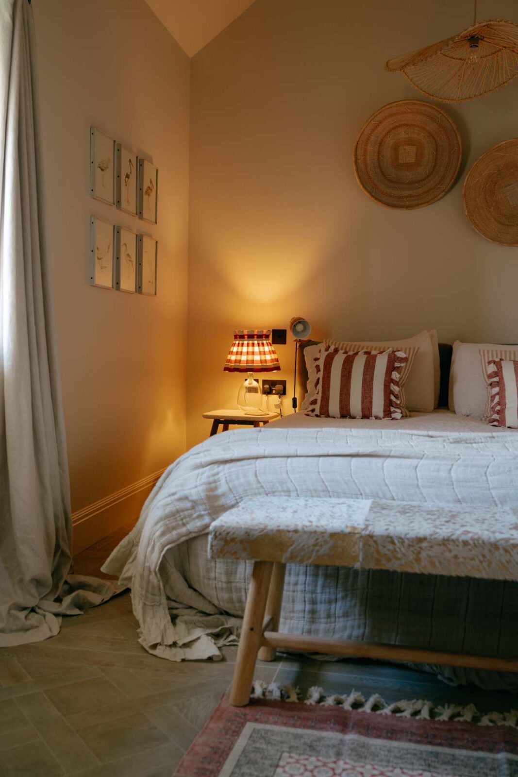 Once a working barn, where horses and carts stood ready for the surrounding fields, The Carthouse now unfolds as a thoughtful balance of old and new. The open-plan living space is grounded by original granite walls and exposed wooden cross beams, alongside softer nods to its coastal location including rattan pendant shades and textured jute rugs.