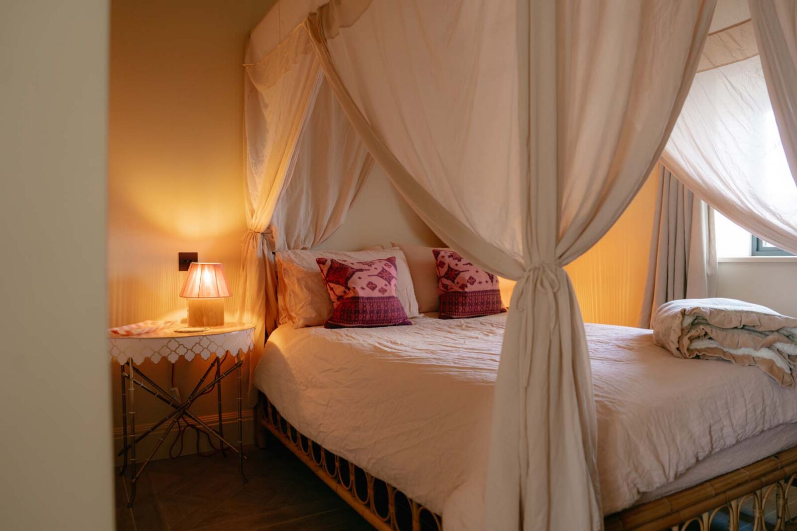 Inside the main house, there are two double bedrooms, decorated with antique finds and organic linens. The master bedroom has a king-size bed and a freestanding silver bathtub. The second bedroom features a four-poster double bed with a draping canopy. There is a shared bathroom with a shower for these two bedrooms, complete with vibrant coral-hued tiles.