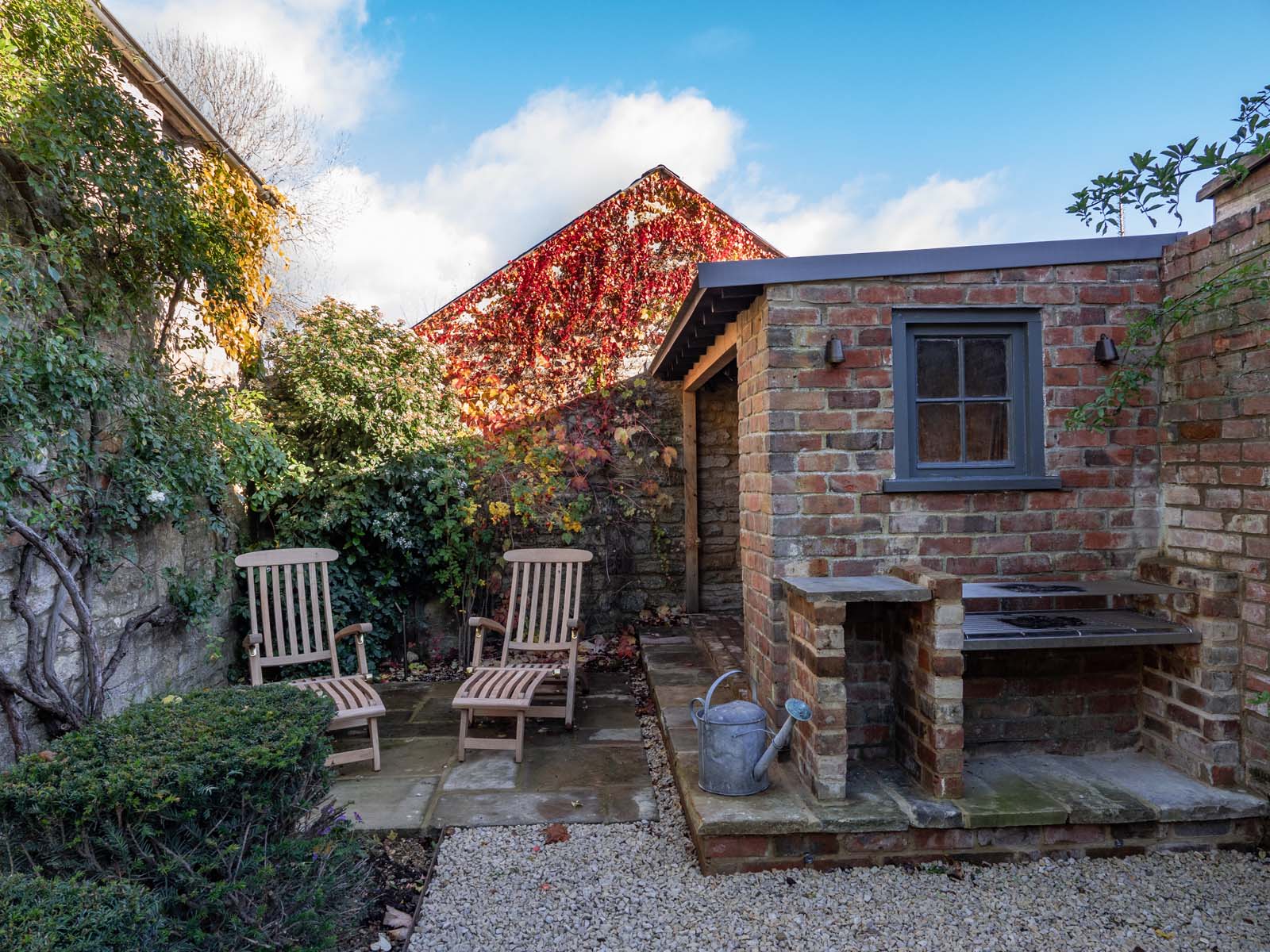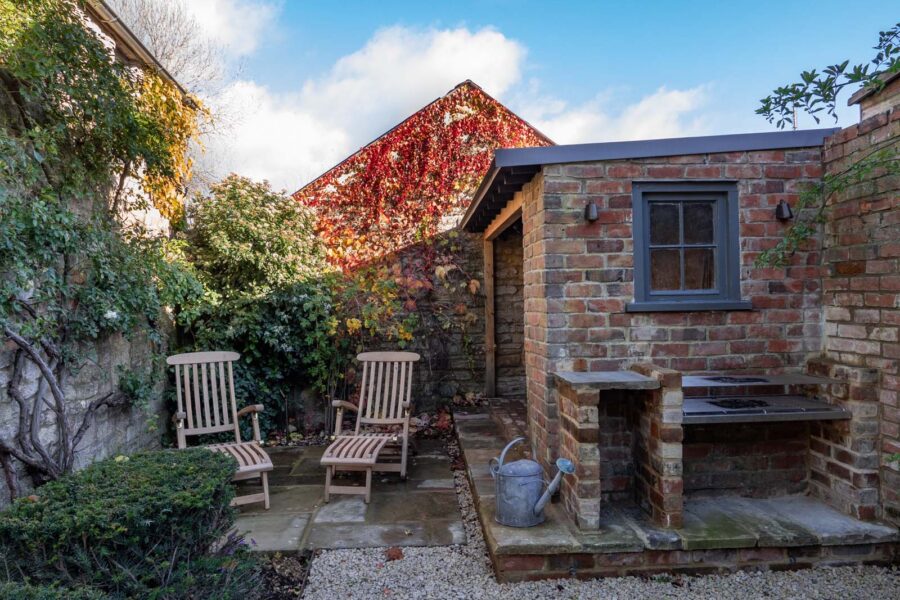 The pretty courtyard garden at Five Bells Cottage is home to an outdoor dining set-up, a built-in BBQ and two deckchairs. The garden is walled, dotted with climbers, and fully enclosed (handy for a dog), making it an excellent sun trap in the summer months.