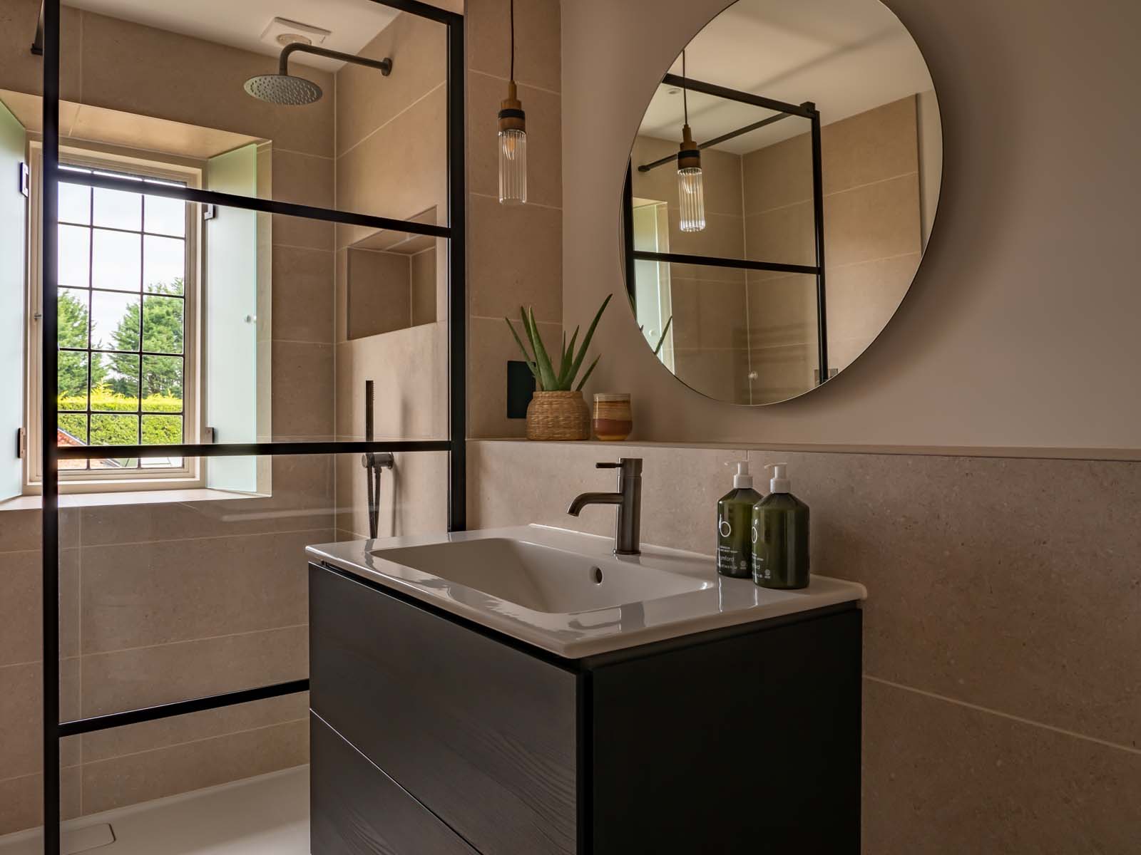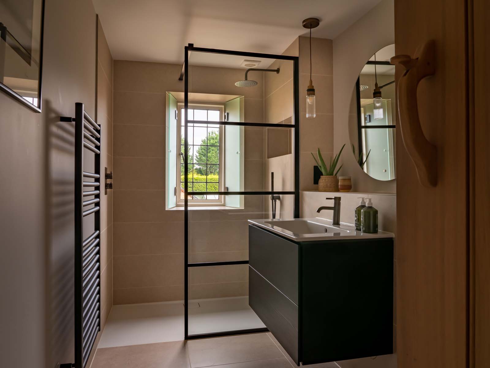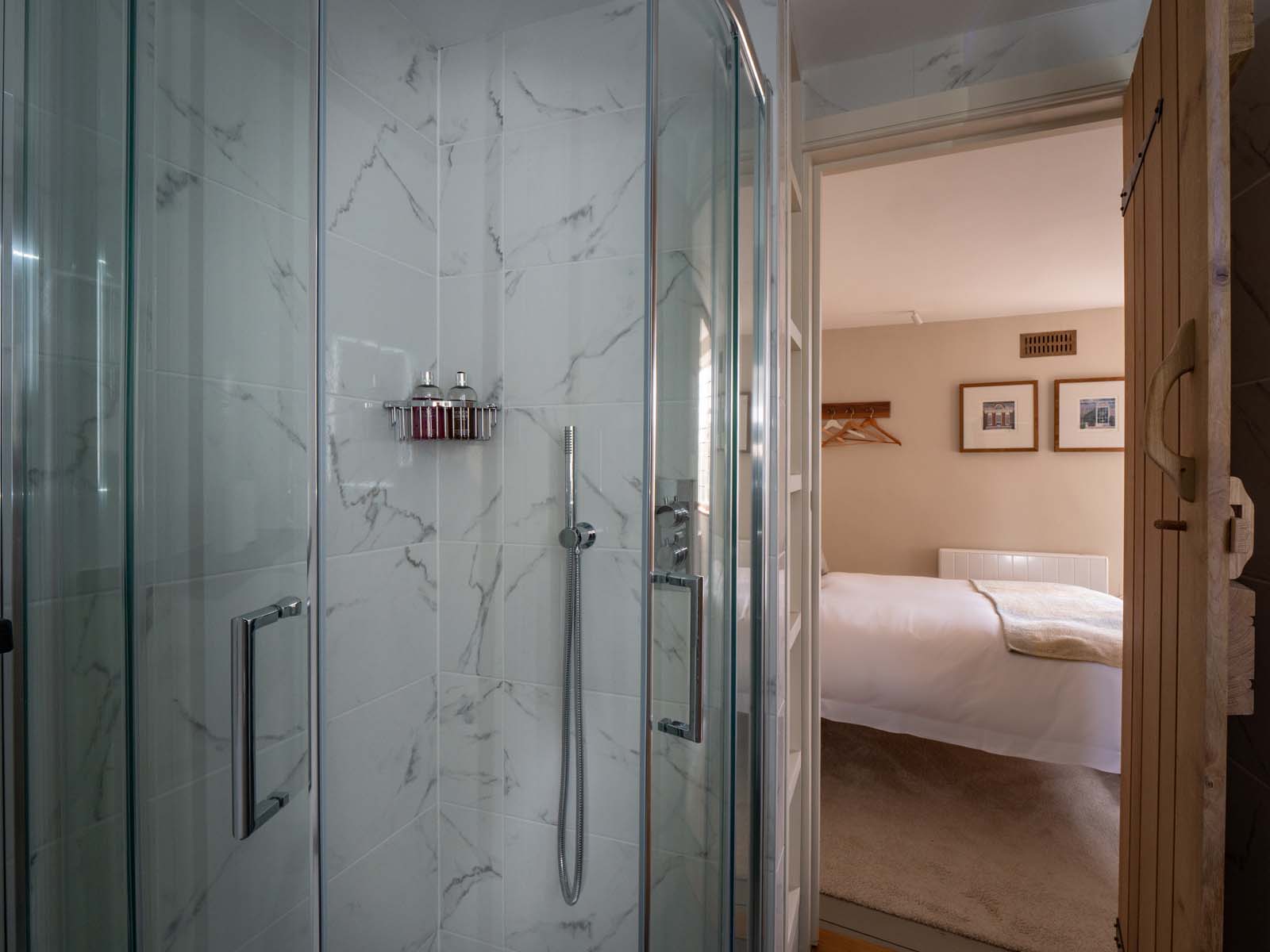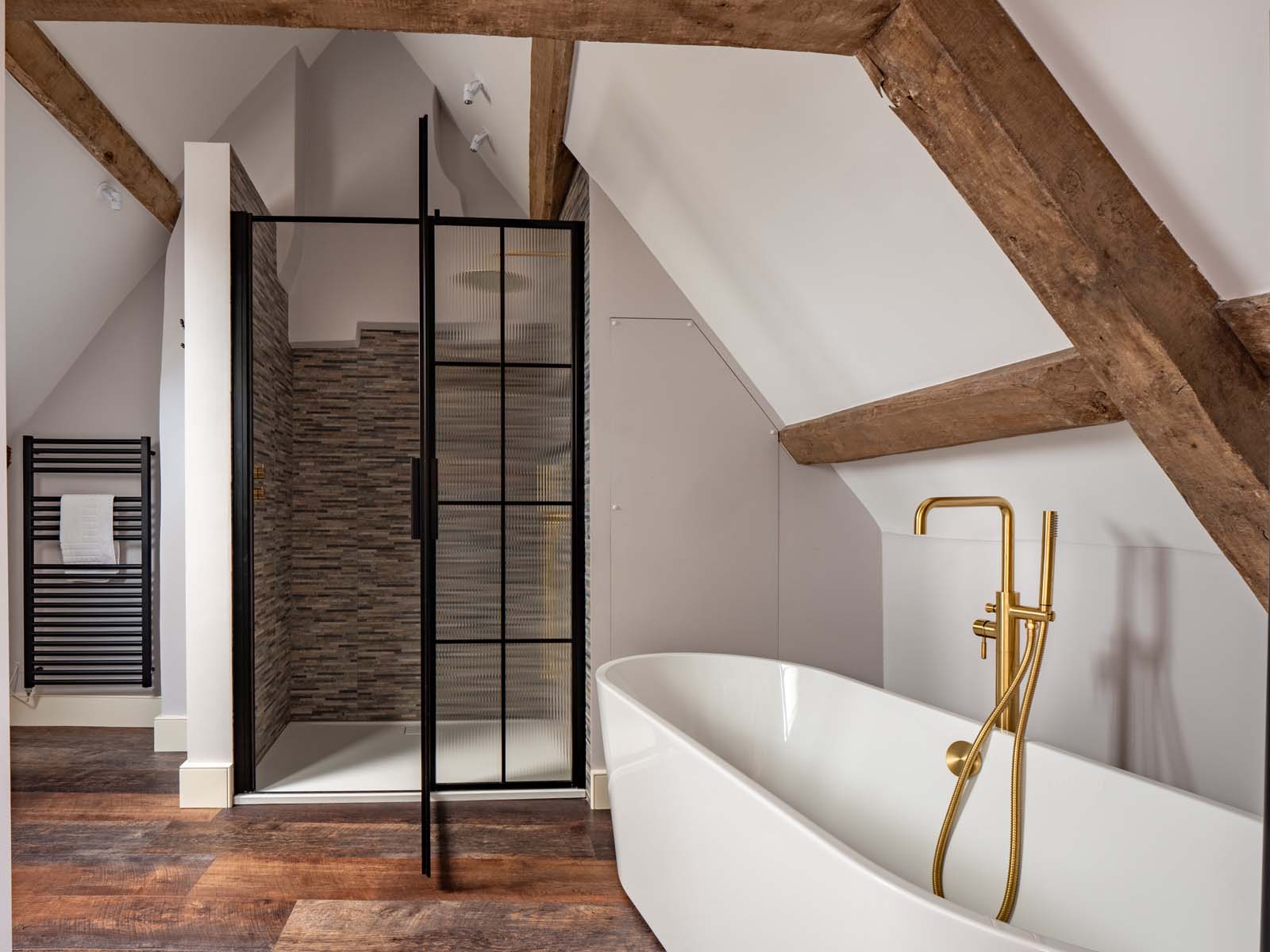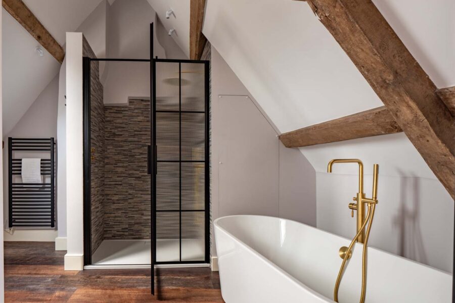 There are two bedrooms on the first floor, both with en-suite shower rooms, and a generous third bedroom on the top floor with both a shower and a freestanding bath. Please note that there’s a steep staircase leading up to the second floor.