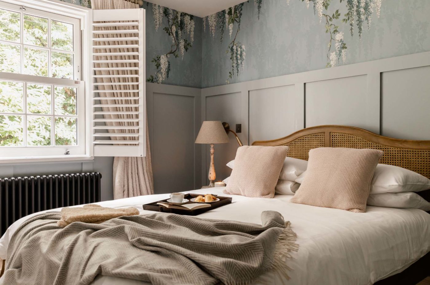 Upstairs, you have the Master Bedroom to your right and a large family bathroom to your left. The Master Bedroom is its very own peaceful sanctuary, with fresh white linens and a statement rattan headboard, all enveloped by striking wisteria mural wallpaper. The family bathroom sings of style and grandeur, with its peachy-pink coated walls, giant pear-shaped bathtub and marble-lined rainfall shower.