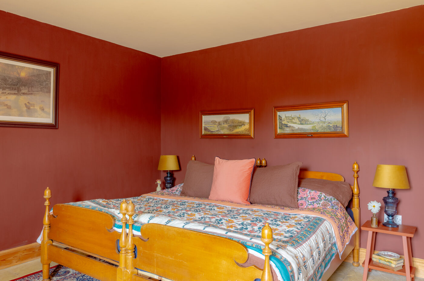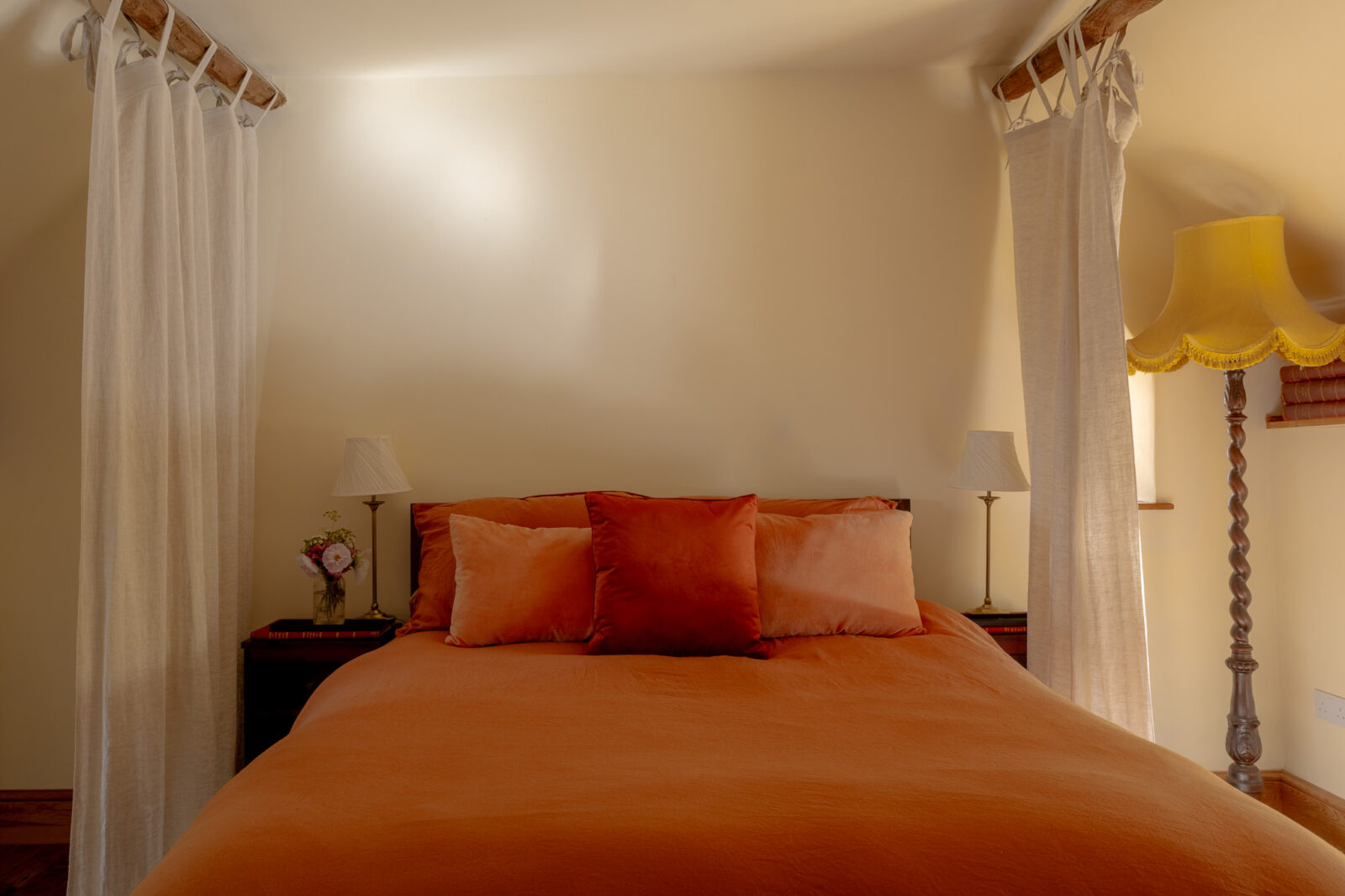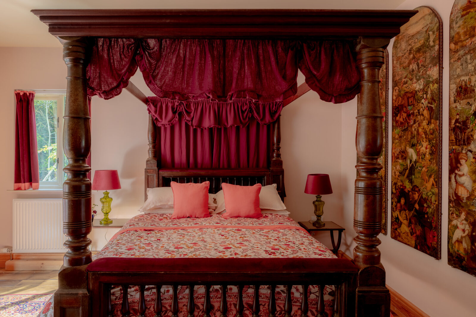 All of the bedrooms have their own distinct character, with playful touches like grand four-poster beds, intricate tapestries, and dramatic drapes. Two Super-King and two King-size bedrooms split across the ground and first floor sleep eight guests comfortably, while a secret alcove with a mattress upstairs is sure to be a hit with additional younger guests. There are two shower rooms on the ground floor and a bathroom with a shower head on the first floor.
