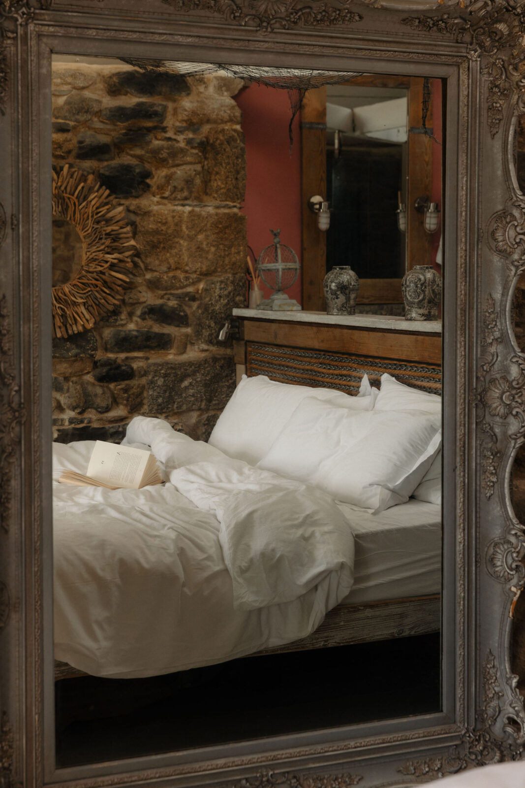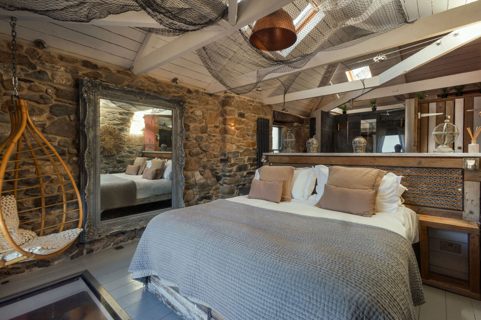Behind this is a generous walk-in bathroom area with a beautiful hammered bronze basin. A super-King custom-made bed sits against a headboard inset with rows of rope and chain evocative of the harbour details outside.