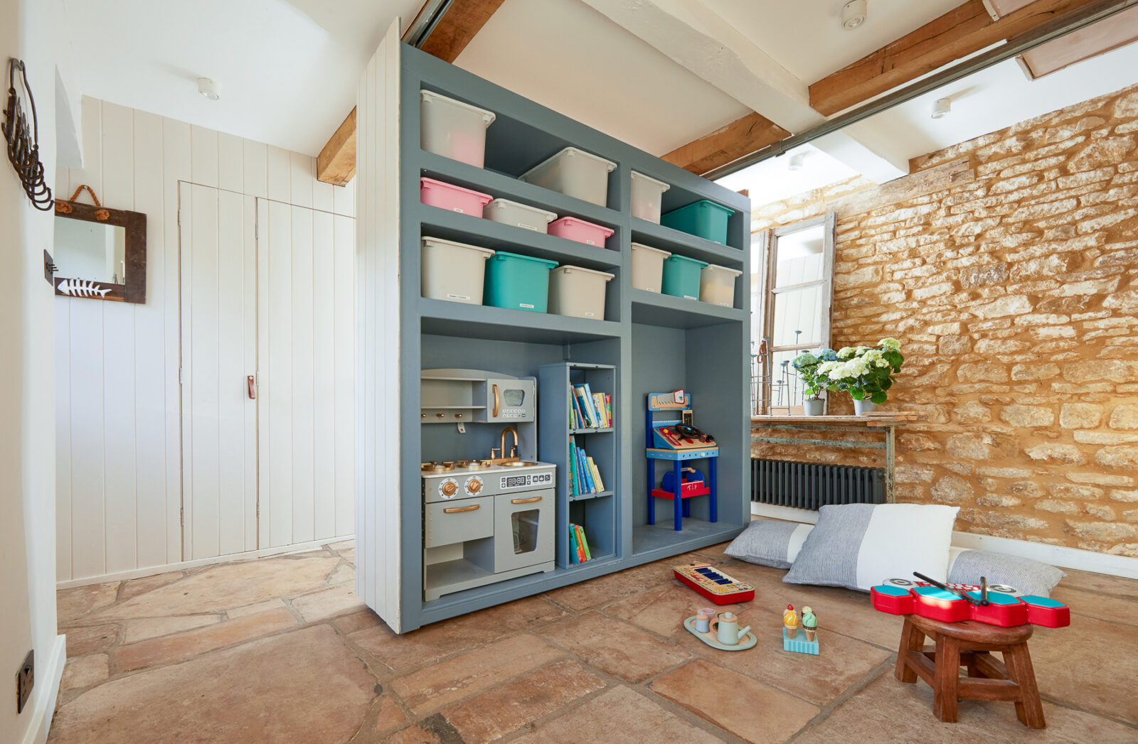 The open-plan kitchen and dining space centres around the feature log burner and overlooks the garden through the industrial-style crittall doors. There’s a separate cosy living room with an L-shaped sofa and open fire, ideal for hunkering down in winter nights with a film or a board game, plus a playroom tucked away behind a sliding door for little ones. You’ll also find a laundry room and downstairs loo on this floor.