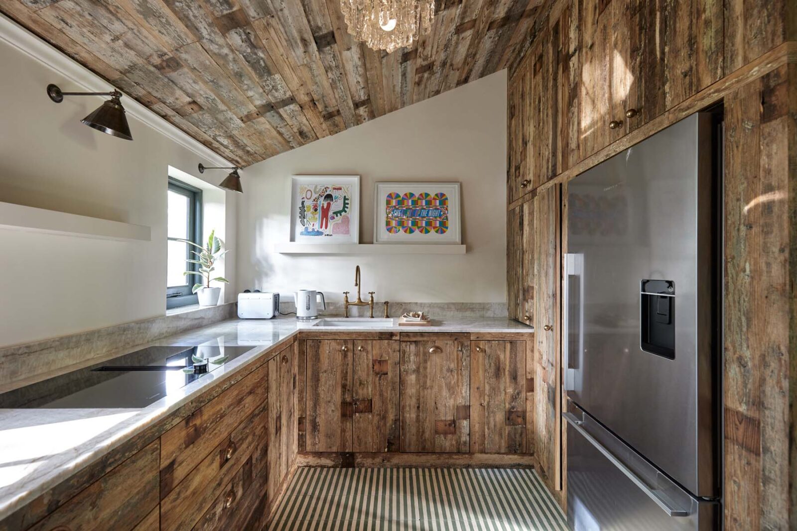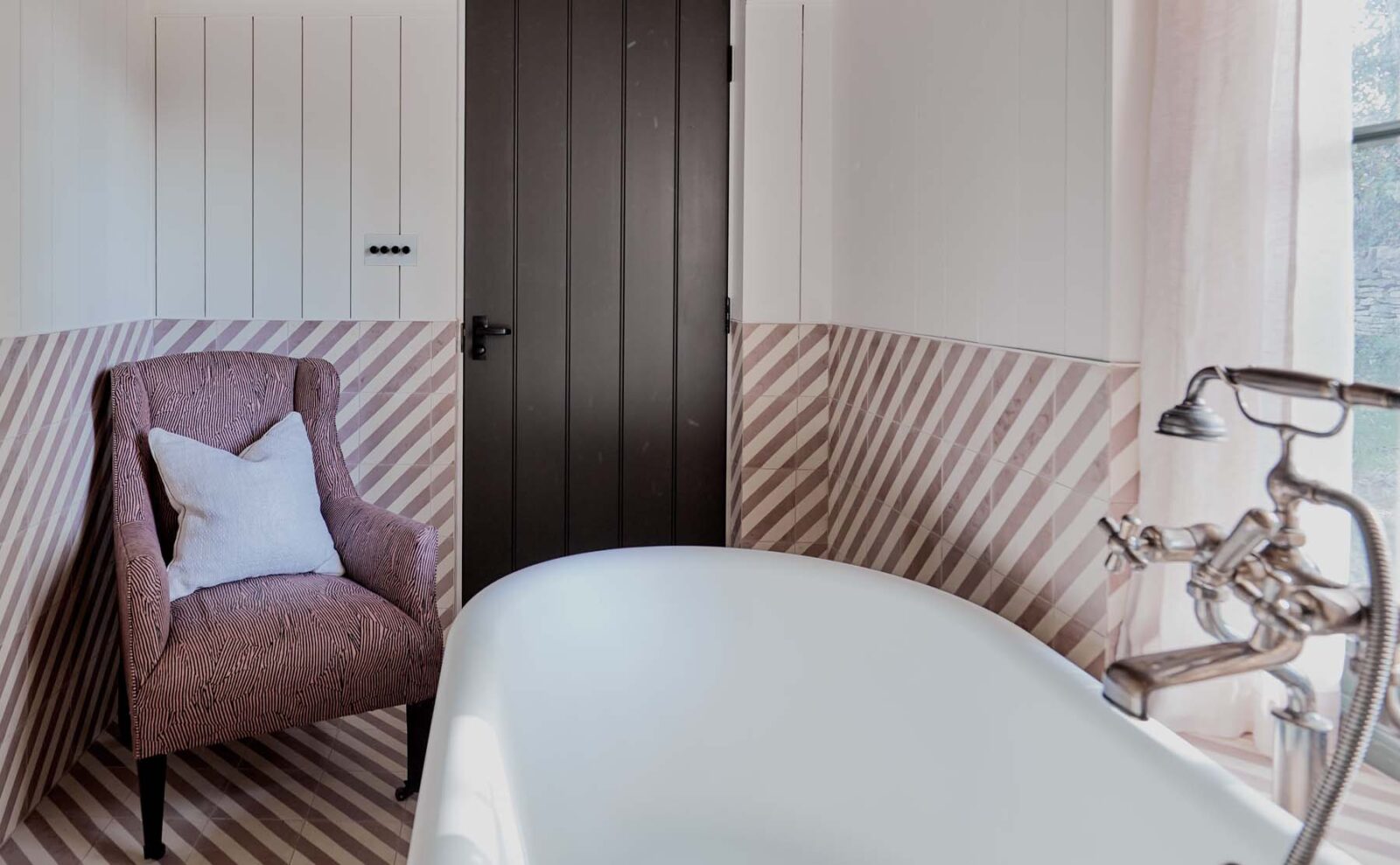 Follow the Hansel-and-Gretel-like pathway to your Cotswolds hideaway, where you’ll be enticed in by bold striped floors and wooden panelled walls (sadly not made of gingerbread) that extend up into the impressive vaulted ceiling. The space has been expertly designed with industrial style windows, raw materials and earthy textures, all whipped together with an elegant palette of coffee and creams together with deep forest greens.