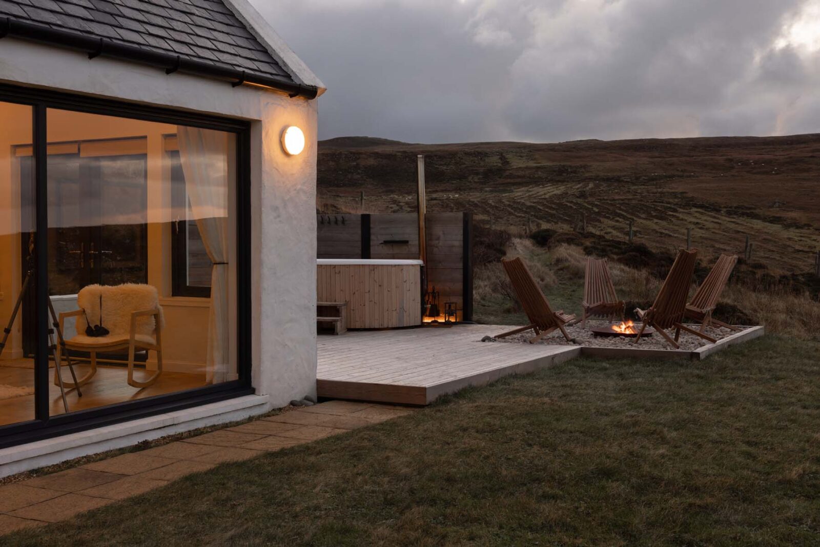 A garden surrounds the house and opens up to the wild landscape around. The Swedish-style wood-burning hot tub, fire pit and decking is an amazing addition to this unique property.