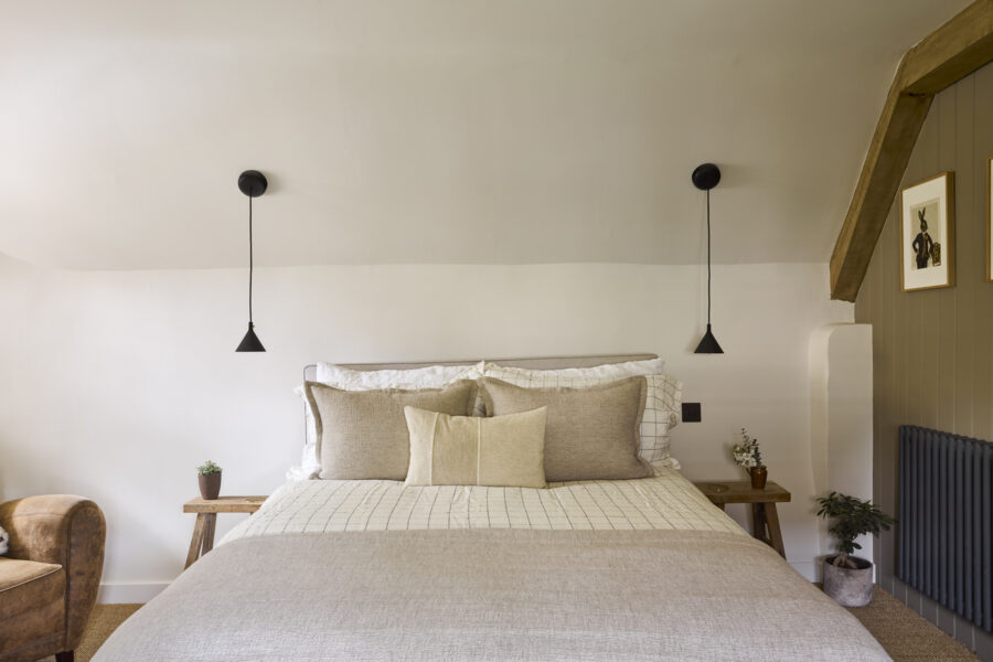 Upstairs you’ll find two beautiful bedrooms that are so cosy, they almost have a subtle alpine feel to them. There’s one double room and one twin room, and they benefit from wooden panelled walls, charming sloped ceilings, old wooden beams and chic brass light fittings. The panelling continues into the family bathroom, where you’ll find a bath tub with an overhead rainfall shower.