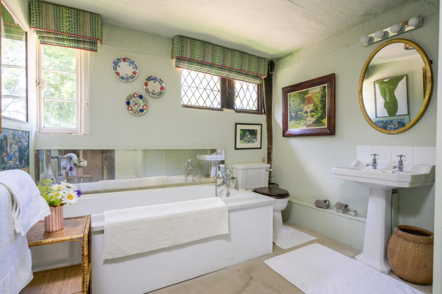 There are five bedrooms in the main house, two super-kings, two kings, and one twin. There is also an additional super-king bedroom in the separate annexe. Each one is cosy, characterful, and comfortable, with a mixture of shared and private bathrooms.