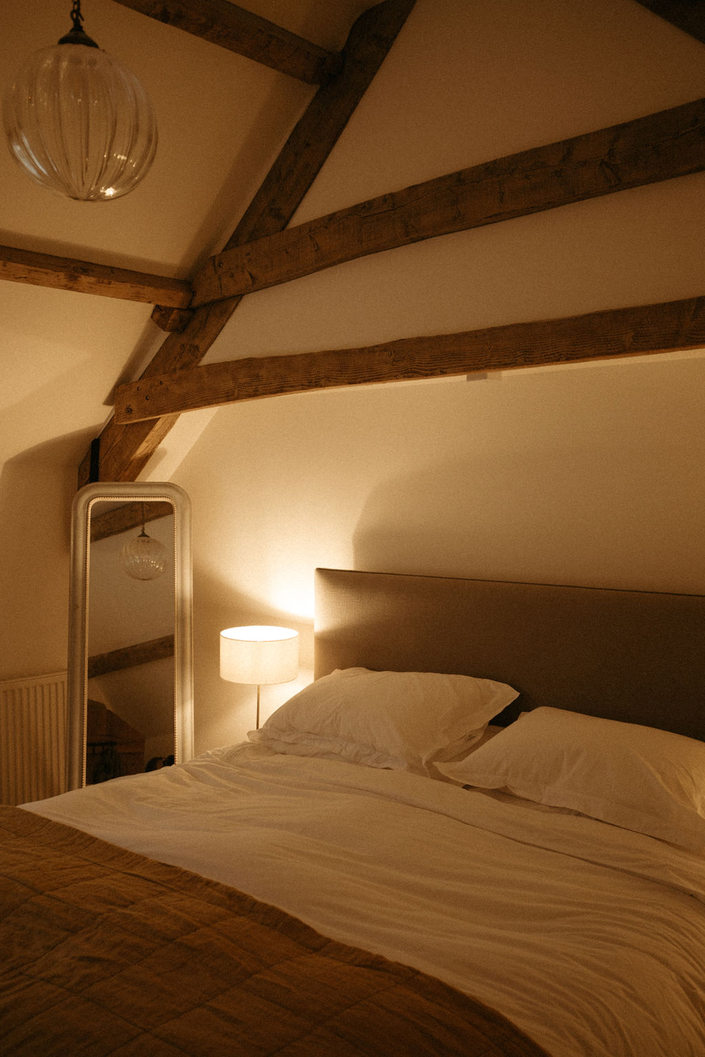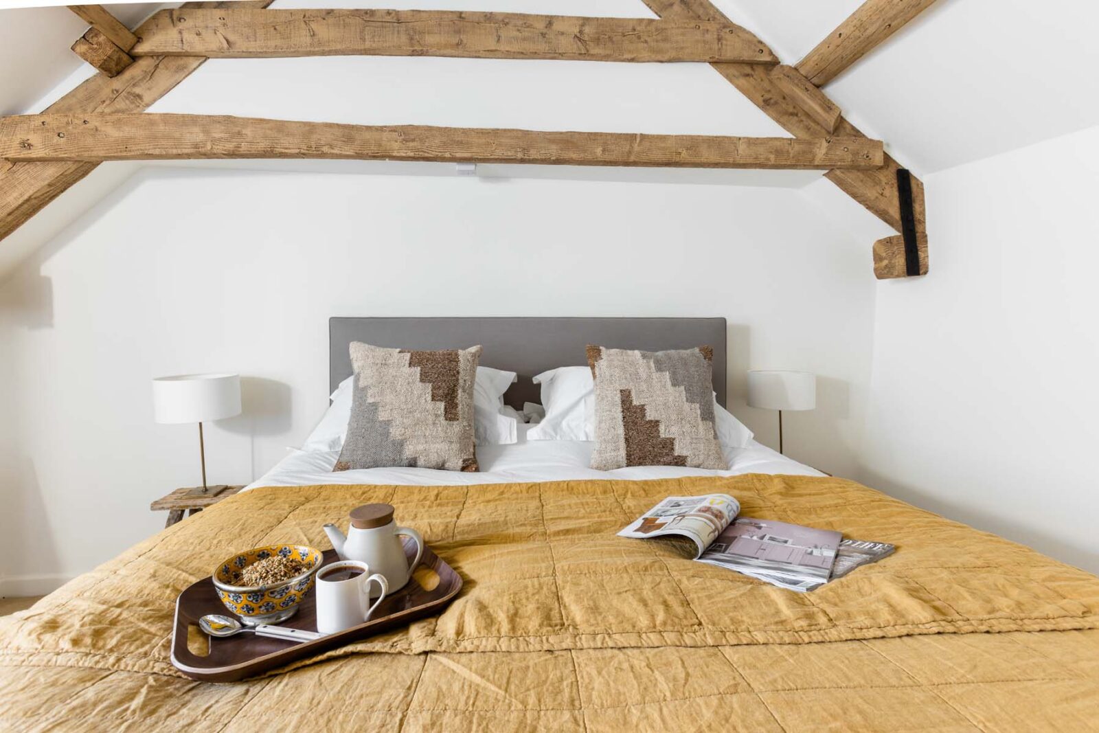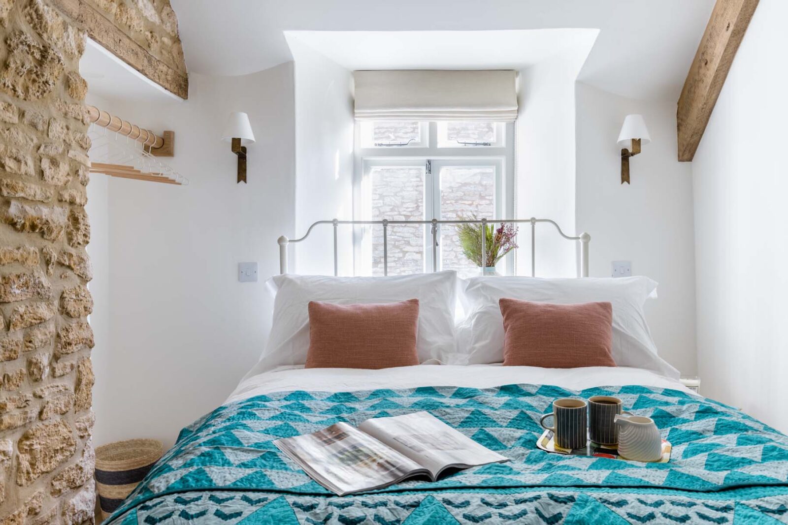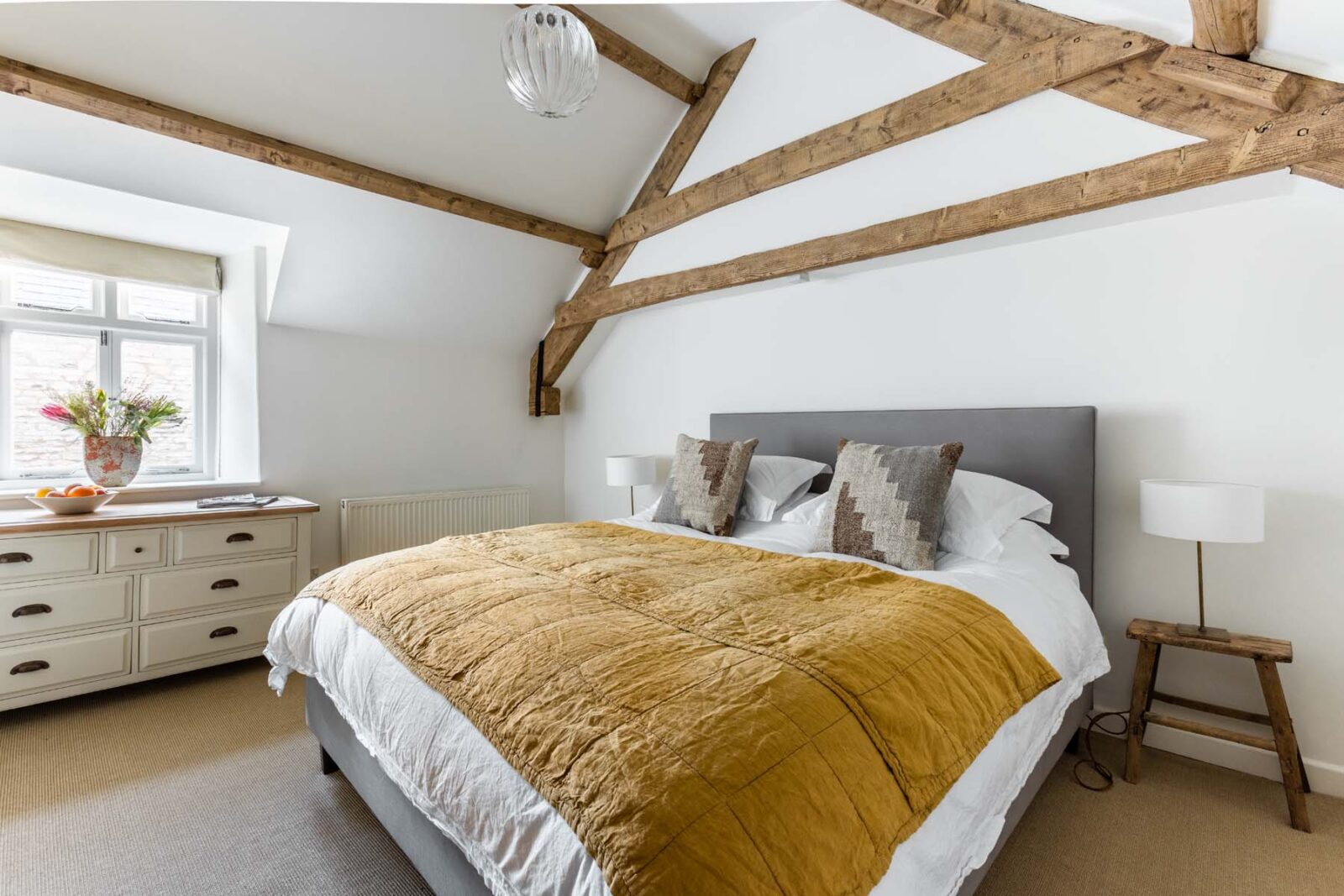Upstairs there are two bedrooms for guests. With a vaulted ceiling, natural light and calming colours, the master bedroom is heaven. There is a king size bed and plenty of wardrobe space for your belongings. The second bedroom has a double bed with stylish bright linens, hanging space for clothes and a honey-coloured Cotswold stone wall.