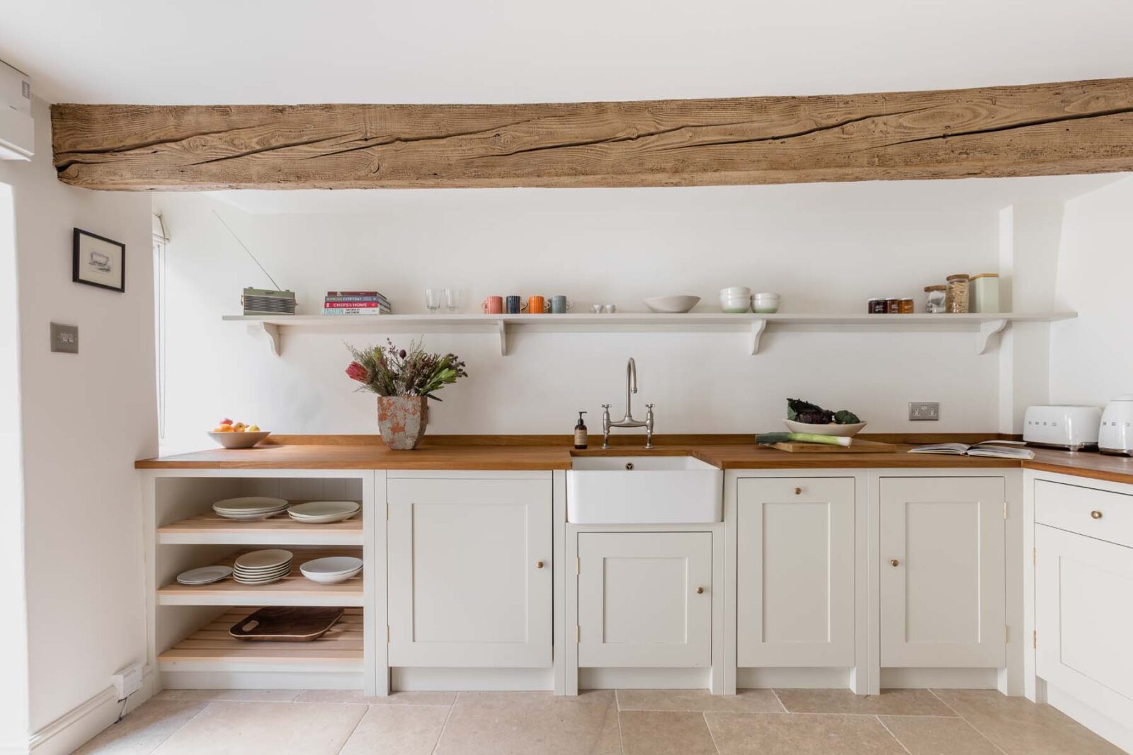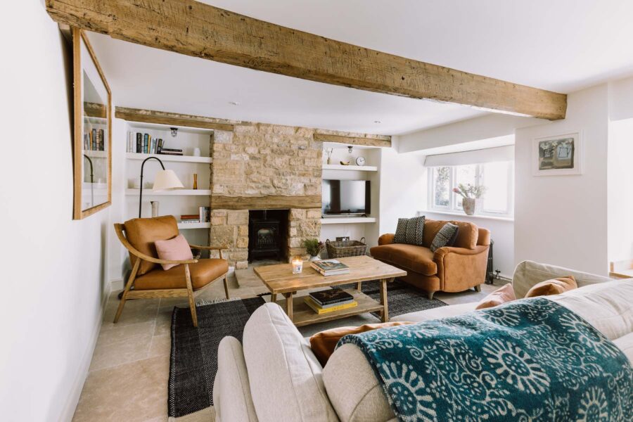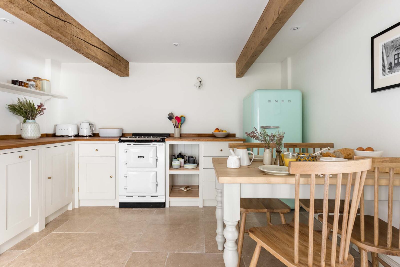 Step into the chic country kitchen with its retro Smeg fridge and essential AGA. The dining table seats four guests and is a perfect spot to enjoy breakfast treats from one of Stow’s artisan bakeries. After a day spent browsing antiques and sampling local ale, the sociable kitchen is a lovely space to gather, cook and enjoy a meal together in the evening.