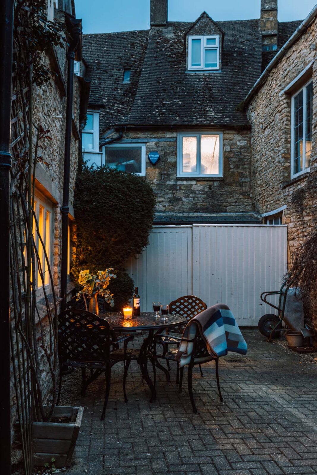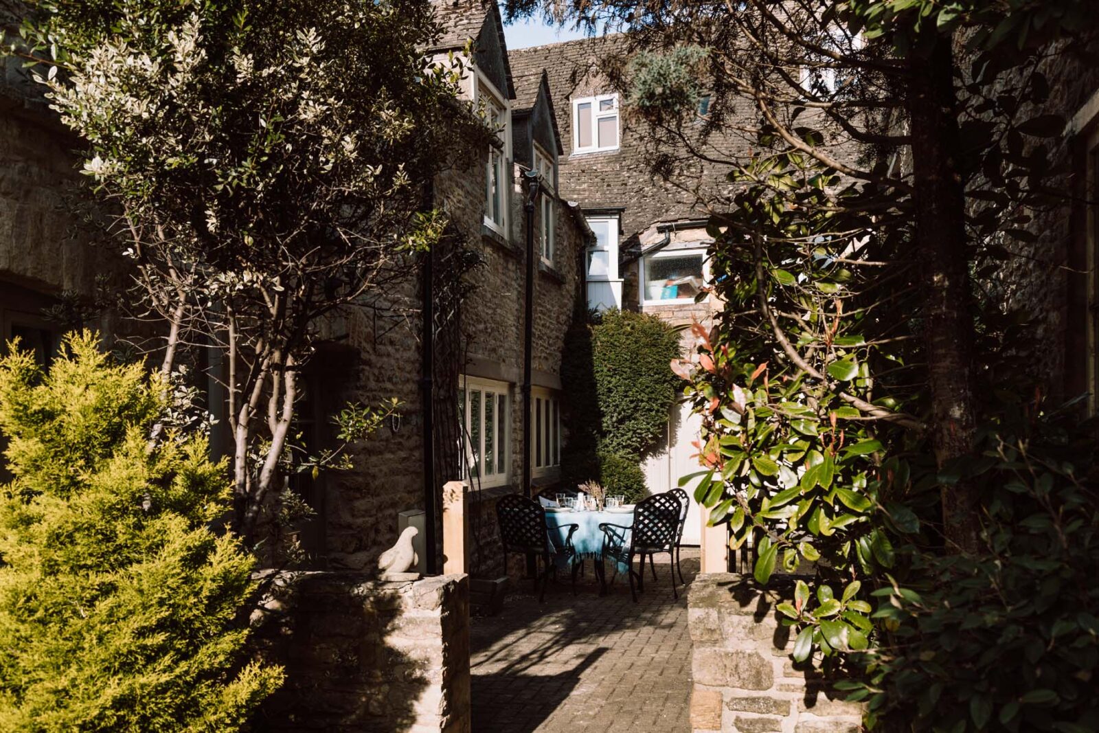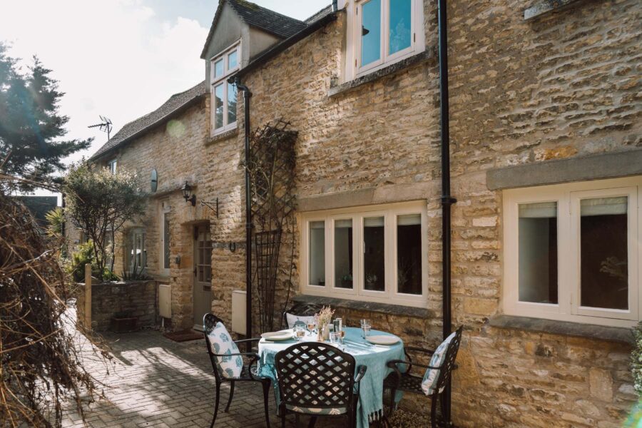A pretty archway of shrubbery leads you to the front door of the cottage and the outside courtyard, where a table and chairs are set up for warm summer nights with a glass of wine or breakfasts in the sunshine.