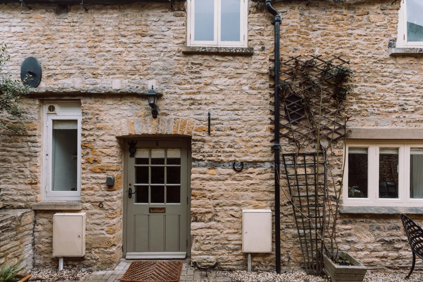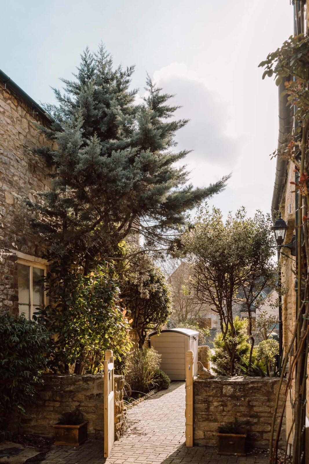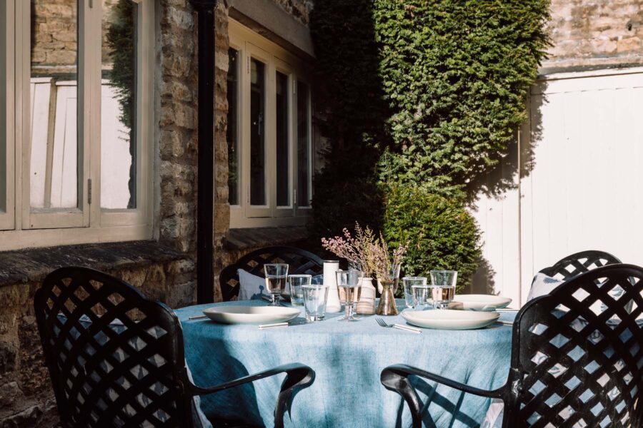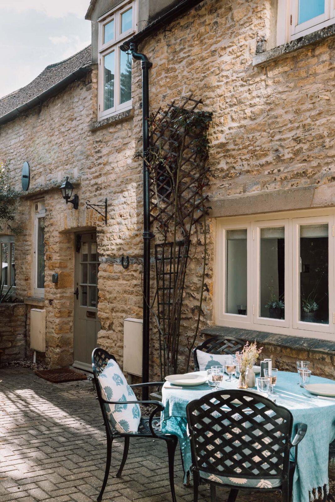 A pretty archway of shrubbery leads you to the front door of the cottage and the outside courtyard, where a table and chairs are set up for warm summer nights with a glass of wine or breakfasts in the sunshine.