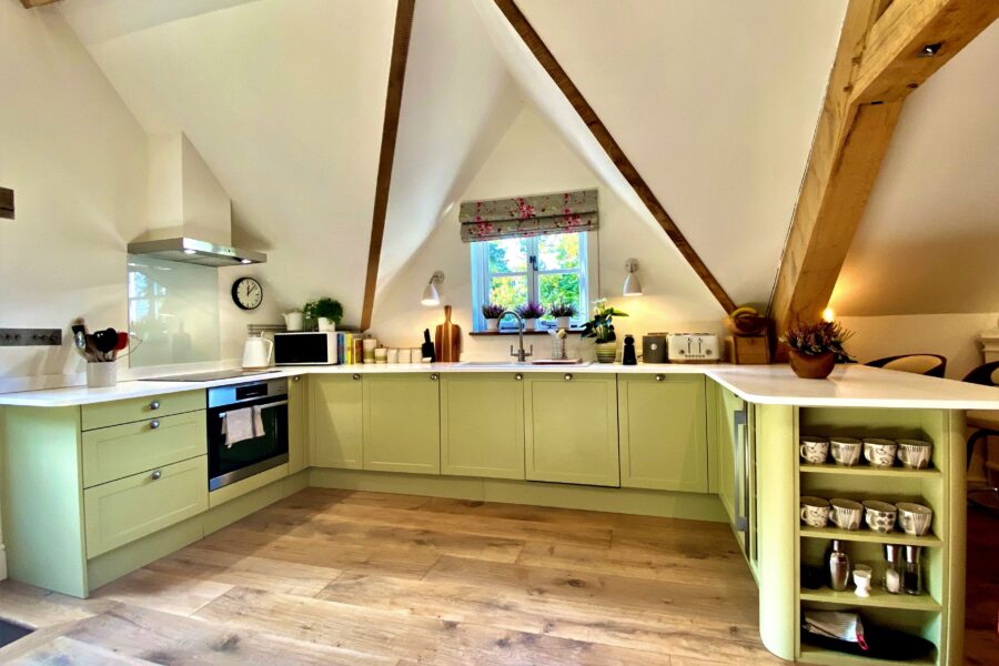 The Coach House’s living space encompasses the whole upper level. Step through the front door, accessed via the tallet steps, into the main living area to find a well-equipped kitchen, generous dining area and a colourful, contemporary living space with a log burner and SMART TV. And most importantly, there’ll be a bottle of champagne chilling in the fridge waiting for you.