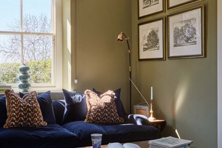 The cosy living room at the end of the hallway has a rustic feel to it, with its polished wooden floors and locally sourced antique furniture. After a long day of exploring quaint Cotswolds villages, you can sink into the deep blue velvet sofa, and for a quiet read you have a well-curated stash of architecture and gardening books, in homage to the owner’s passion for sustainability and the property’s original occupier – the gardener of the Standish House estate.