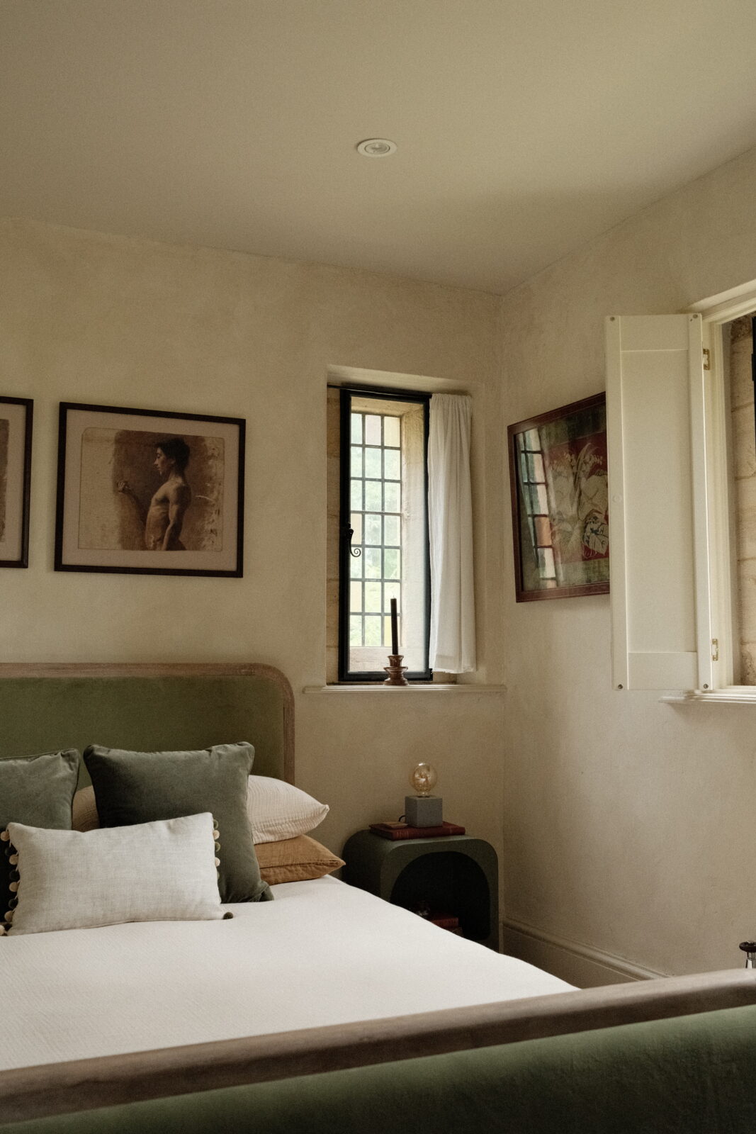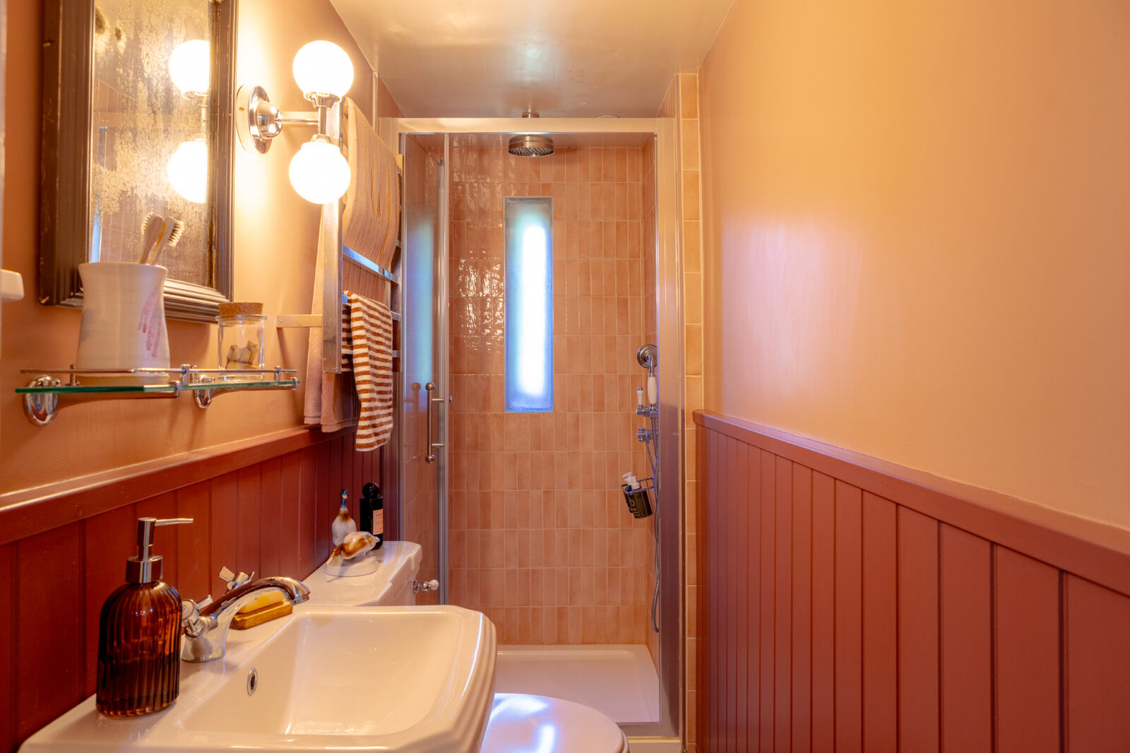There are two bedrooms at The Lodge, each one decorated in soothing green or pink. The main, King-size bedroom overlooks the neighbouring paddock and the horses that graze in it, and has a small window seat where you can curl up with a good book. The second bedroom has a double bed and faces the local church. They share a brand-new ground-floor shower room with its own pretty pastel palette.