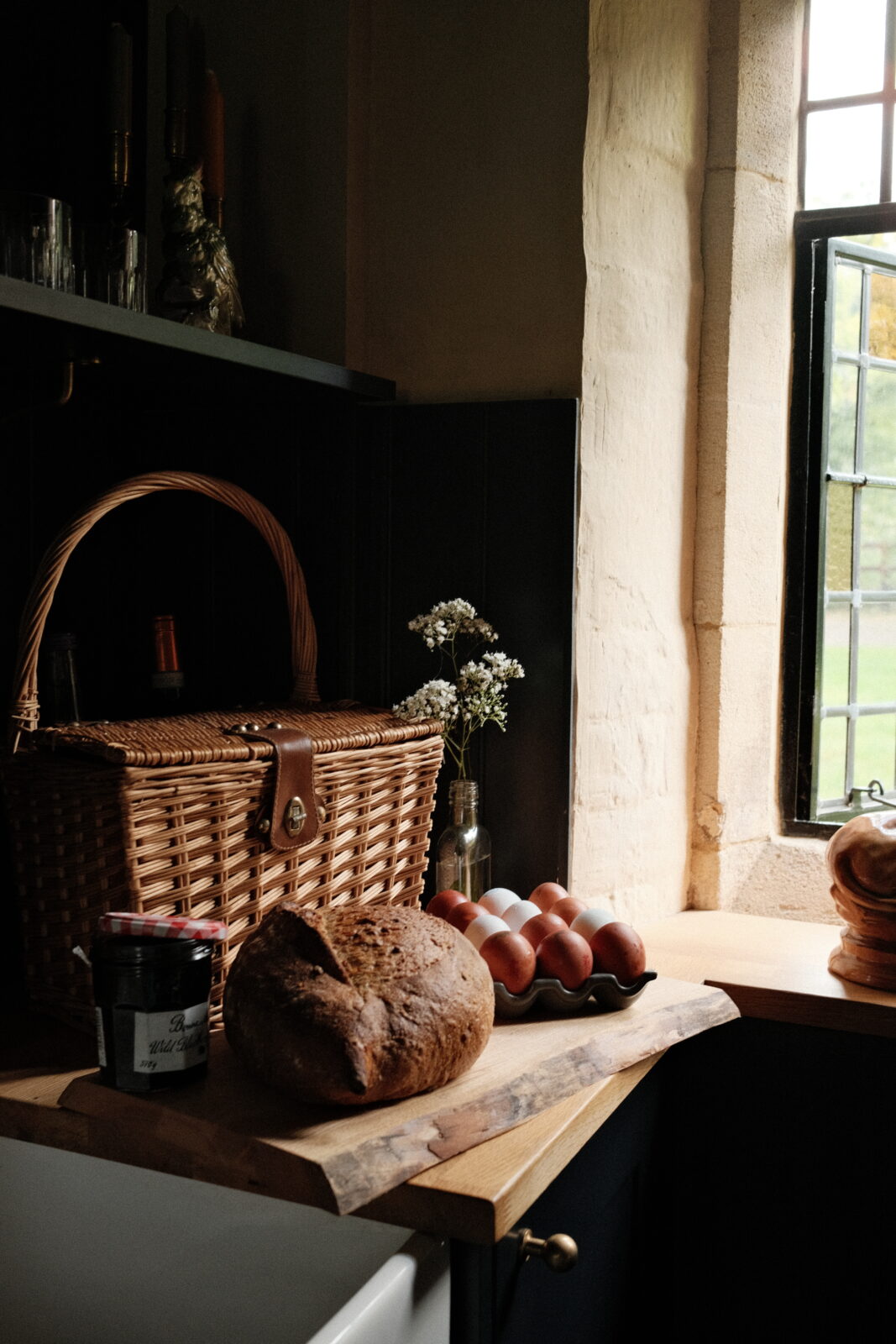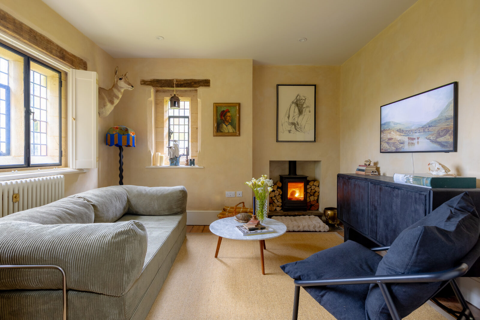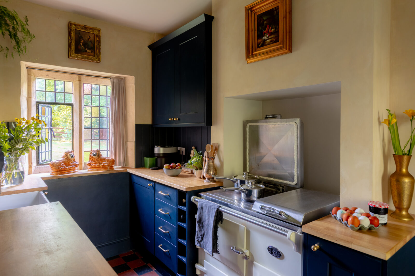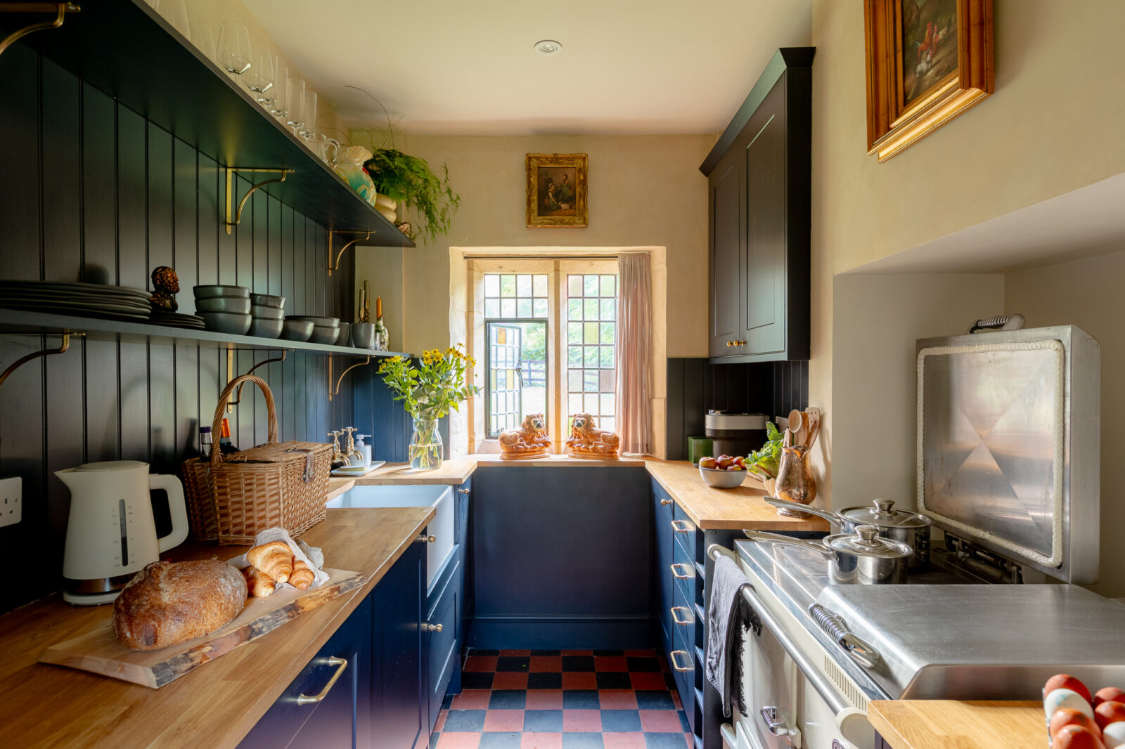 The beautiful galley kitchen is decorated in a rich shade of royal blue, and is a lovely place to whip up culinary delights while overlooking the picture-perfect garden. The living room is cosy and chic, with tasteful furnishings and a wood burner.