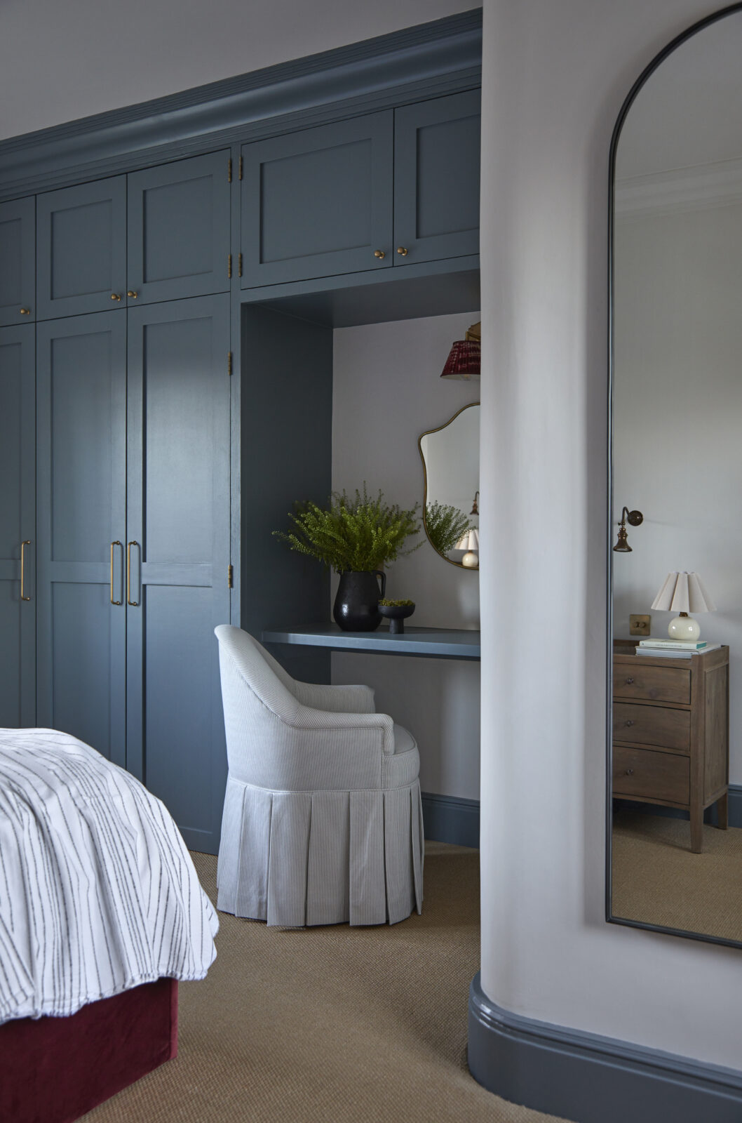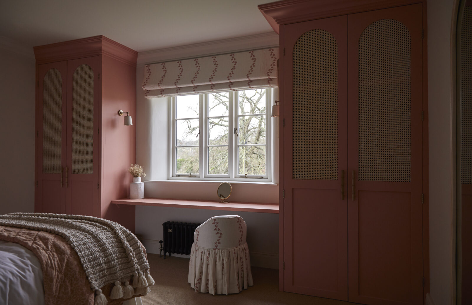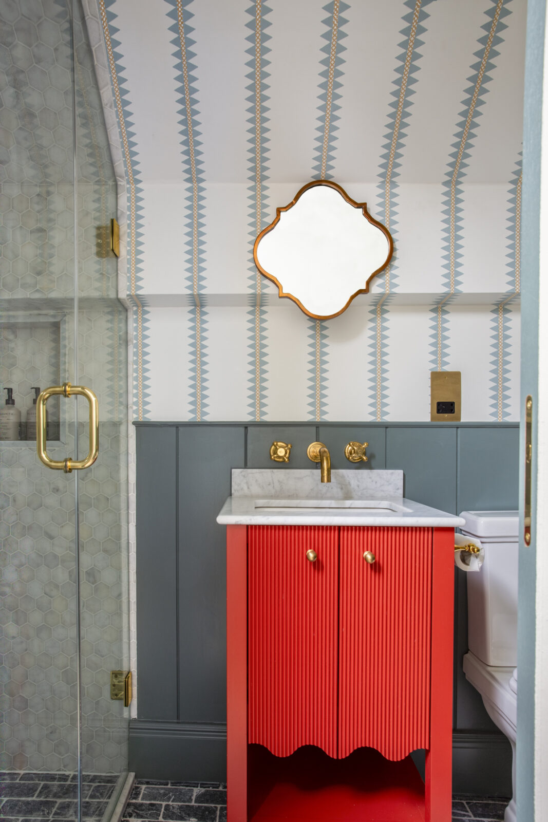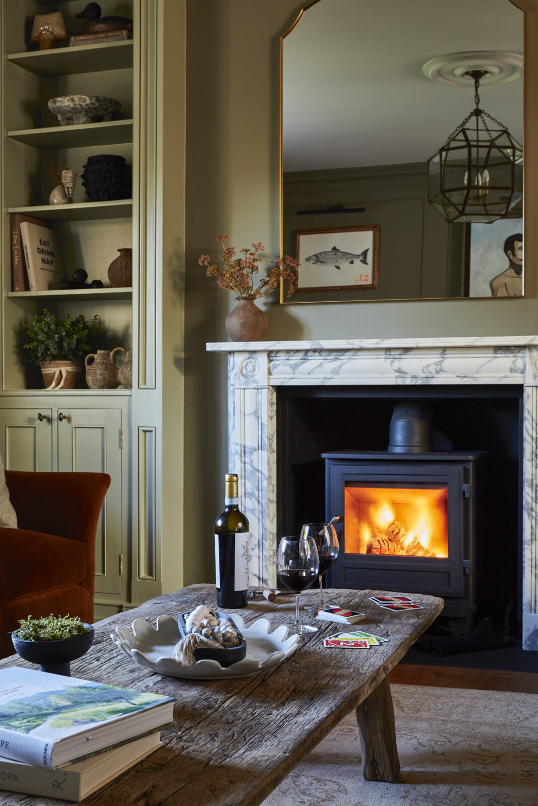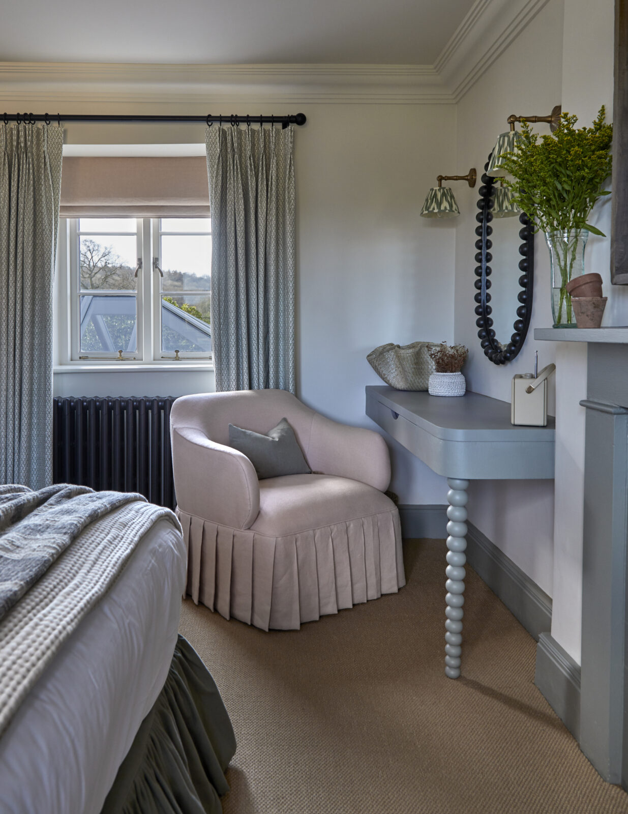On this floor you’ll also find a separate sitting room with sinking velvet sofas and a log burner, a secret snug cinema room, and a downstairs loo. Each carefully curated corner is as playful and as inviting as the next, with a classic Cotswolds palette juxtaposed with pops of colour and playful patterns.