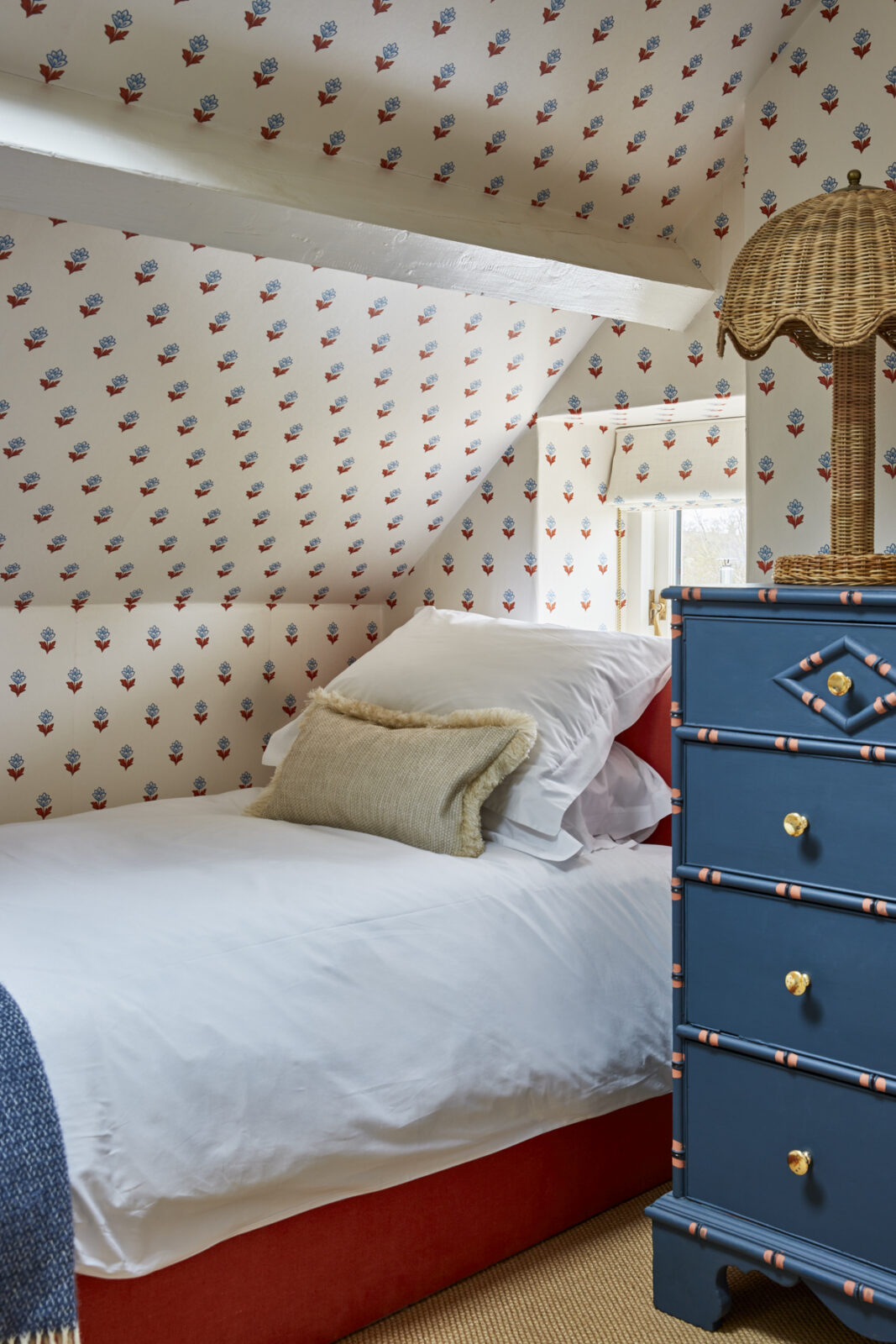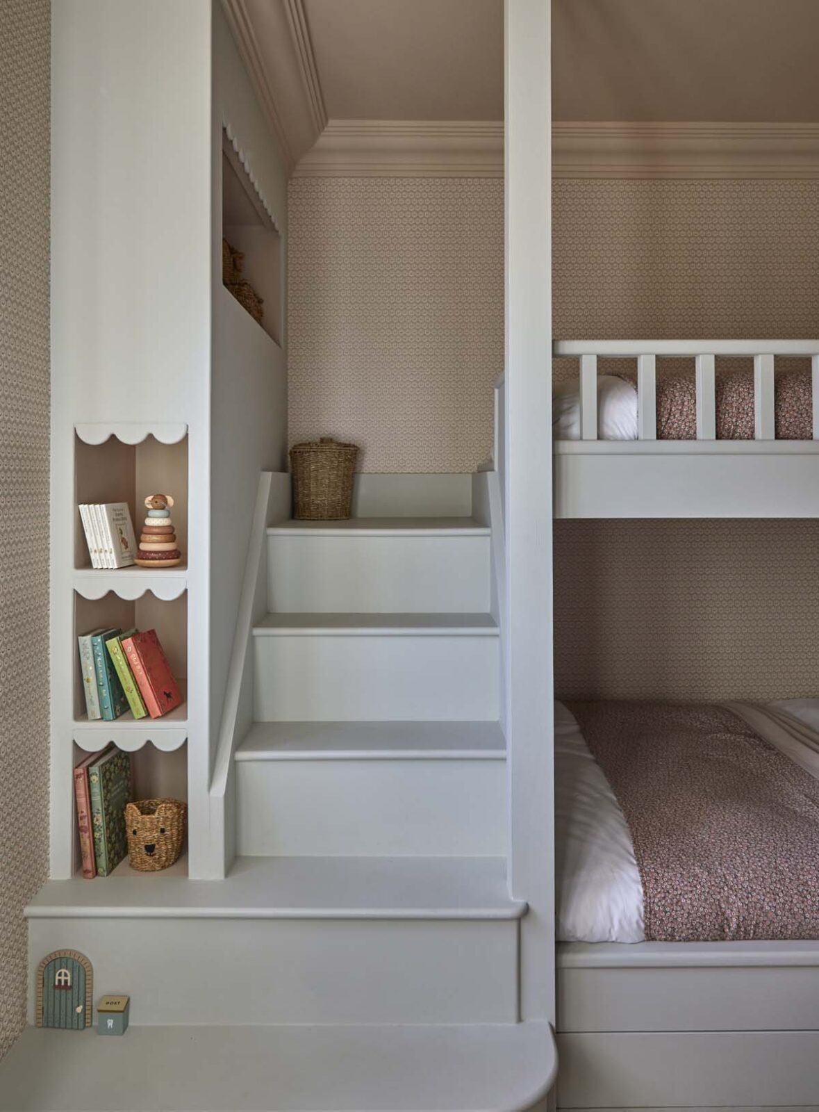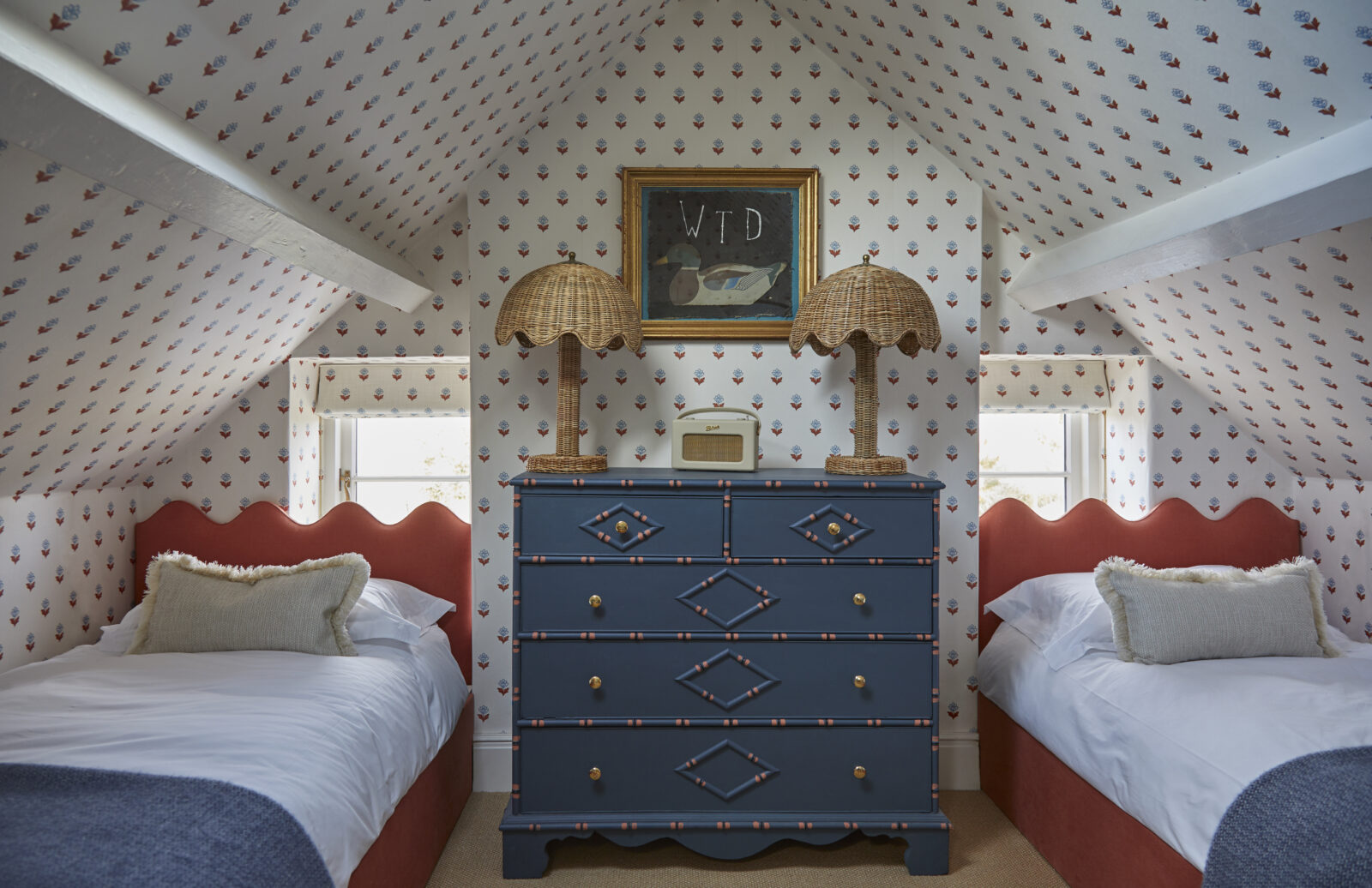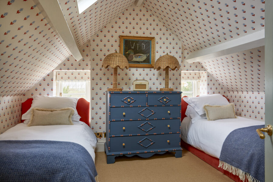 More magic awaits upstairs. On the first floor you’ll find three beautiful double bedrooms (one with an en-suite shower room), a deliciously dinky bunk room, and a chic family bathroom. Up another small set of stairs, you’ll find a further twin room in the eaves and a shower room. Think frills, Roberts radios, patterned wallpaper, rattan shades, scalloped shelves, and walls dotted with artwork sourced from the established HAM interiors – a real design lovers haven.