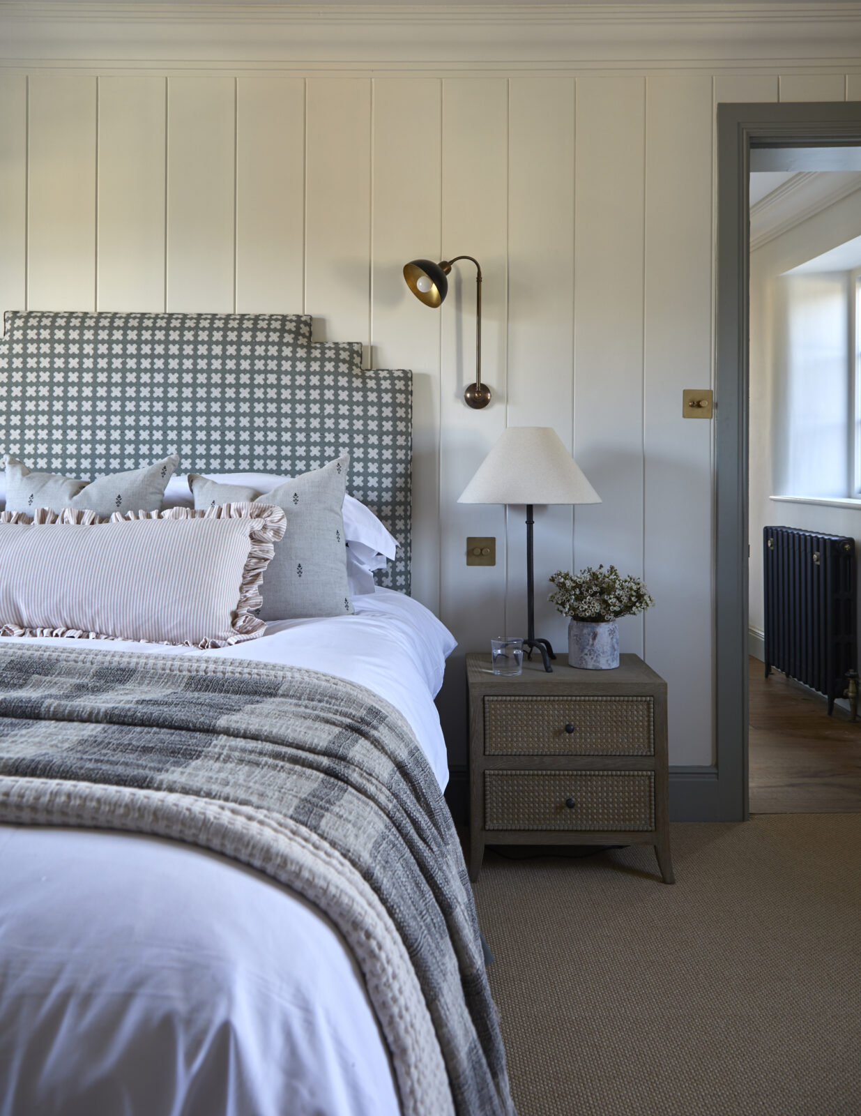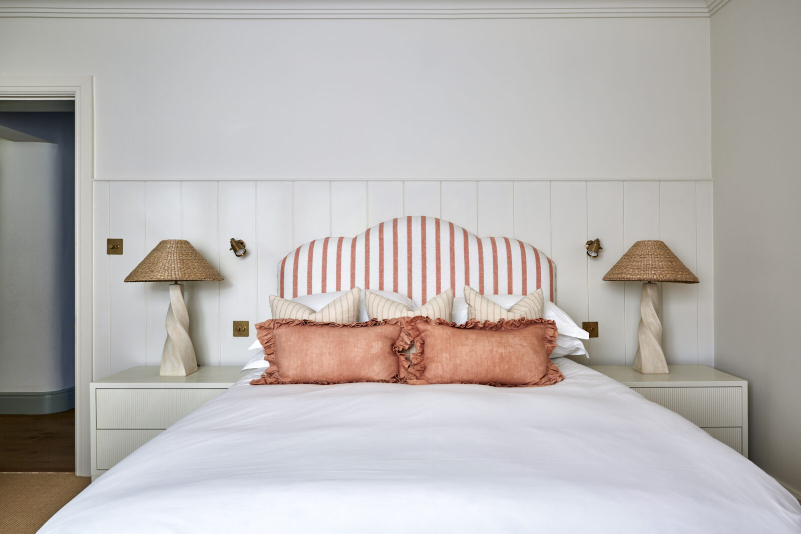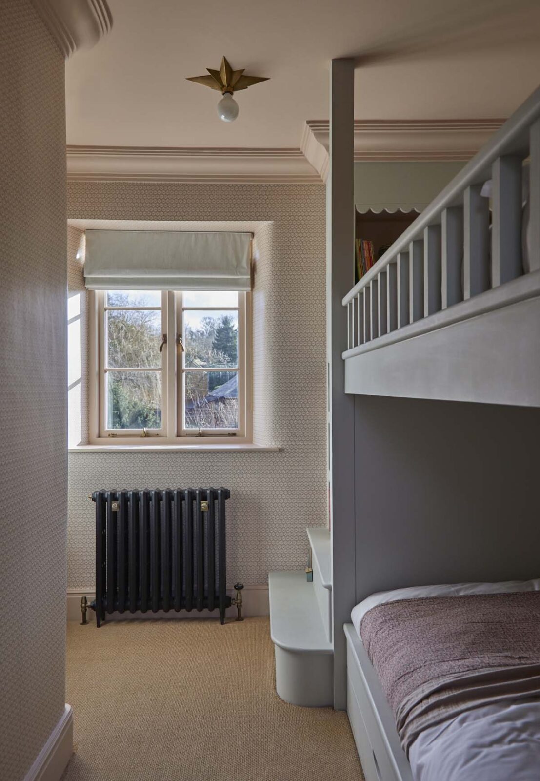 More magic awaits upstairs. On the first floor you’ll find three beautiful double bedrooms (one with an en-suite shower room), a deliciously dinky bunk room, and a chic family bathroom. Up another small set of stairs, you’ll find a further twin room in the eaves and a shower room. Think frills, Roberts radios, patterned wallpaper, rattan shades, scalloped shelves, and walls dotted with artwork sourced from the established HAM interiors – a real design lovers haven.