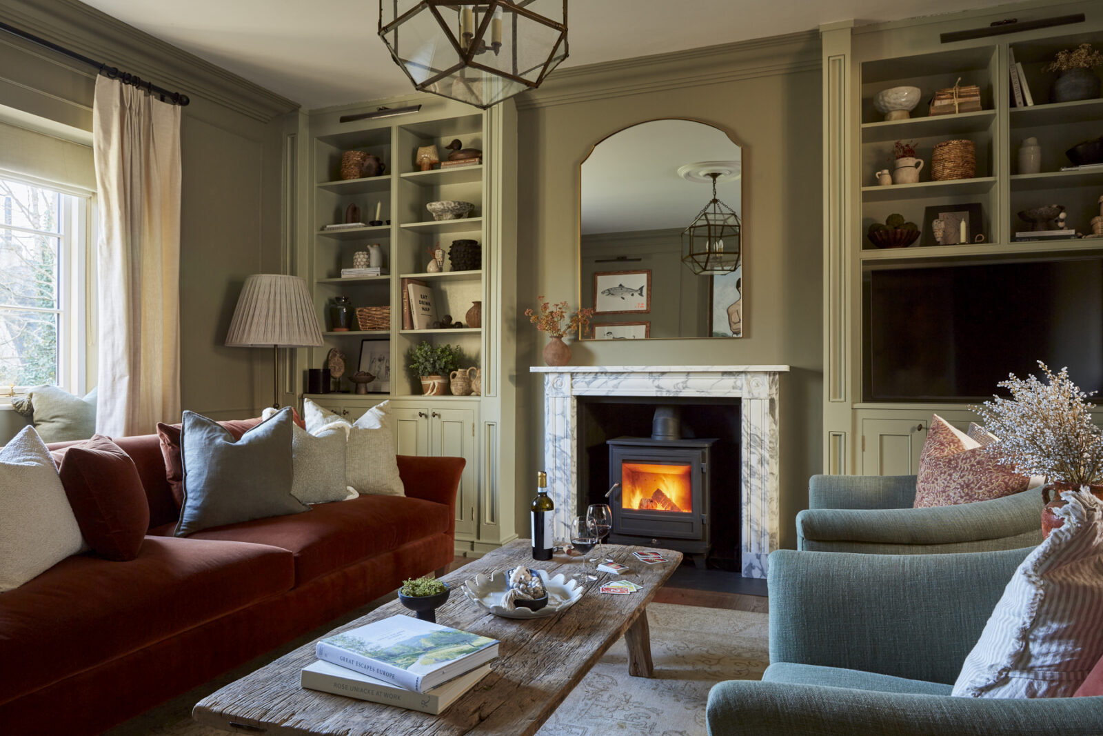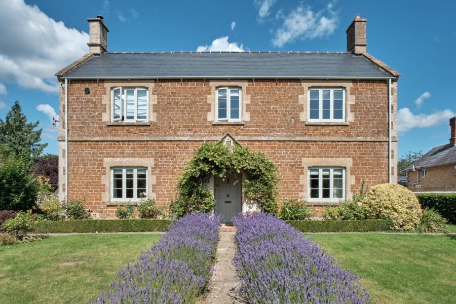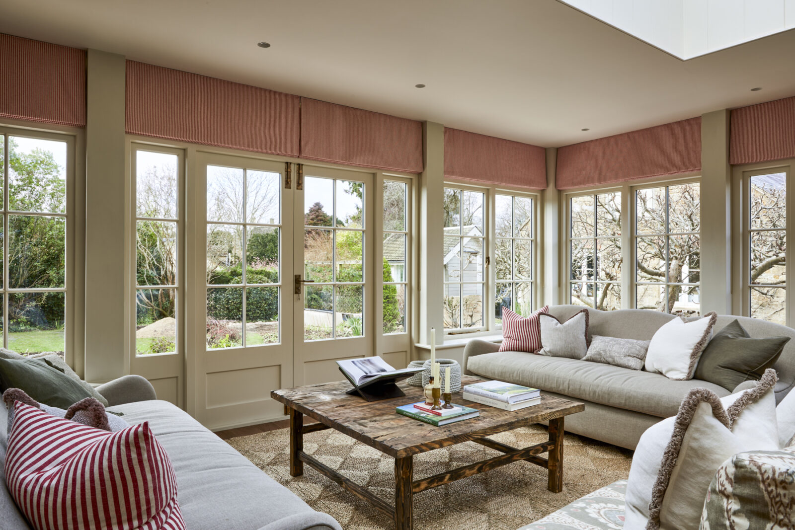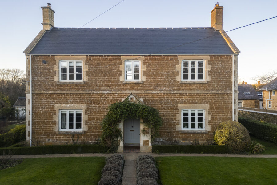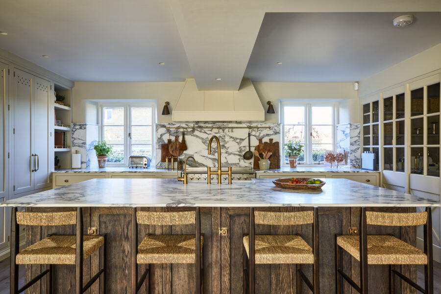 Beyond the honey-hued Cotswolds stone facade awaits a grand entrance hall with statement chequered tiles, enticing you towards the opulent open-plan orangery. Here, you’ll find the central living, kitchen and dining space. Think beautiful bespoke furniture, marble-topped Olaf kitchen cabinets, a dedicated bar space for shaking up cocktails, and a walk-in larder from your wildest dreams. A large farmhouse-style dining table takes centre stage for gathering and feasting, perfect for celebratory soirees and family get-togethers. Zip down the cosy red ticking stripe blinds that wrap their way around the room, to transform the space from day to night.