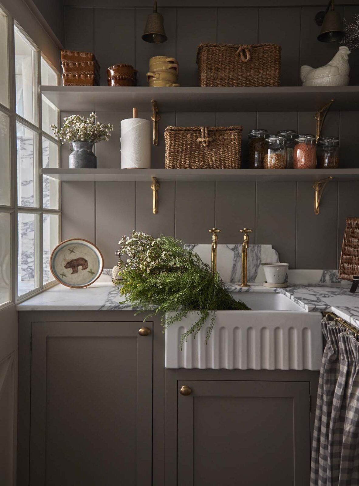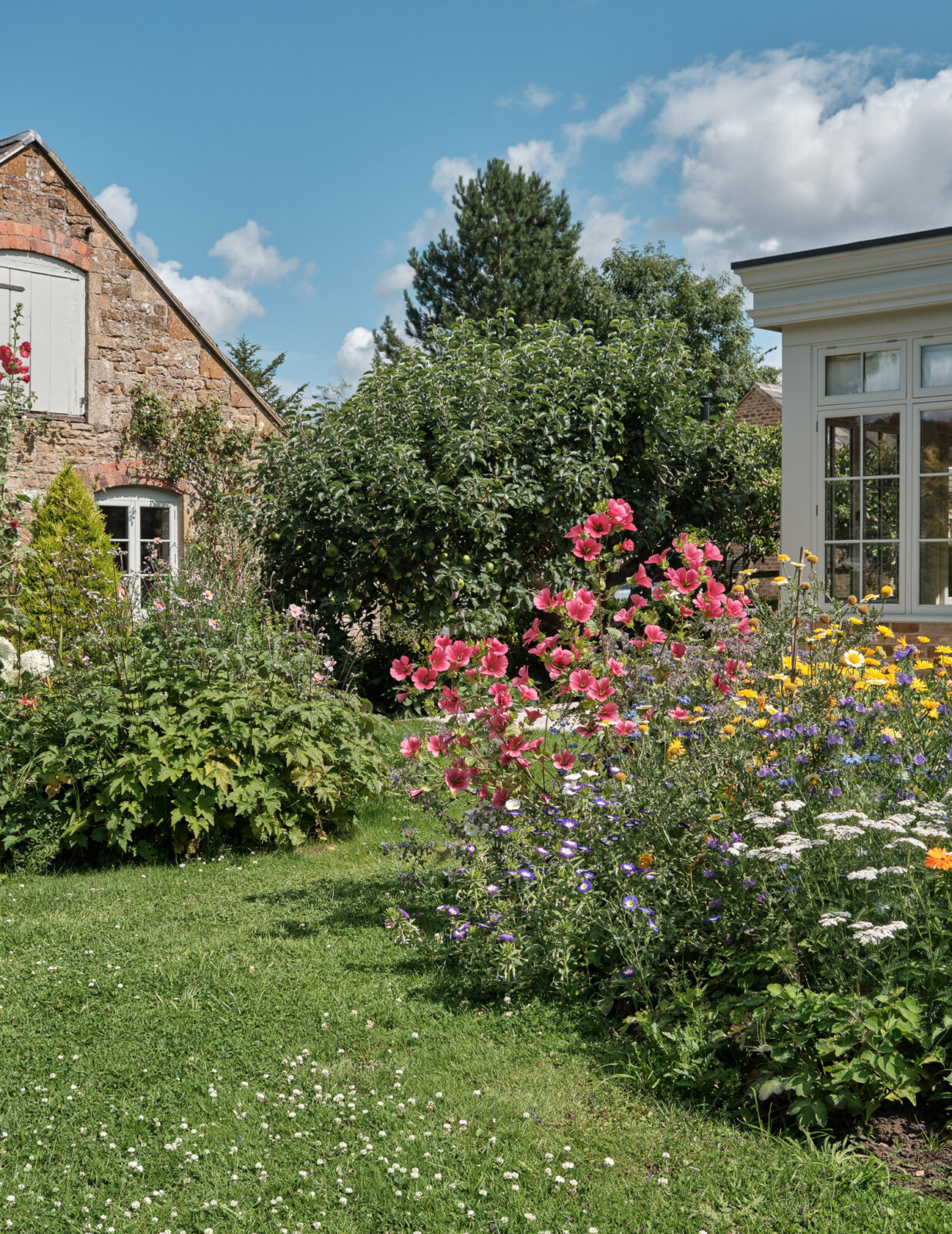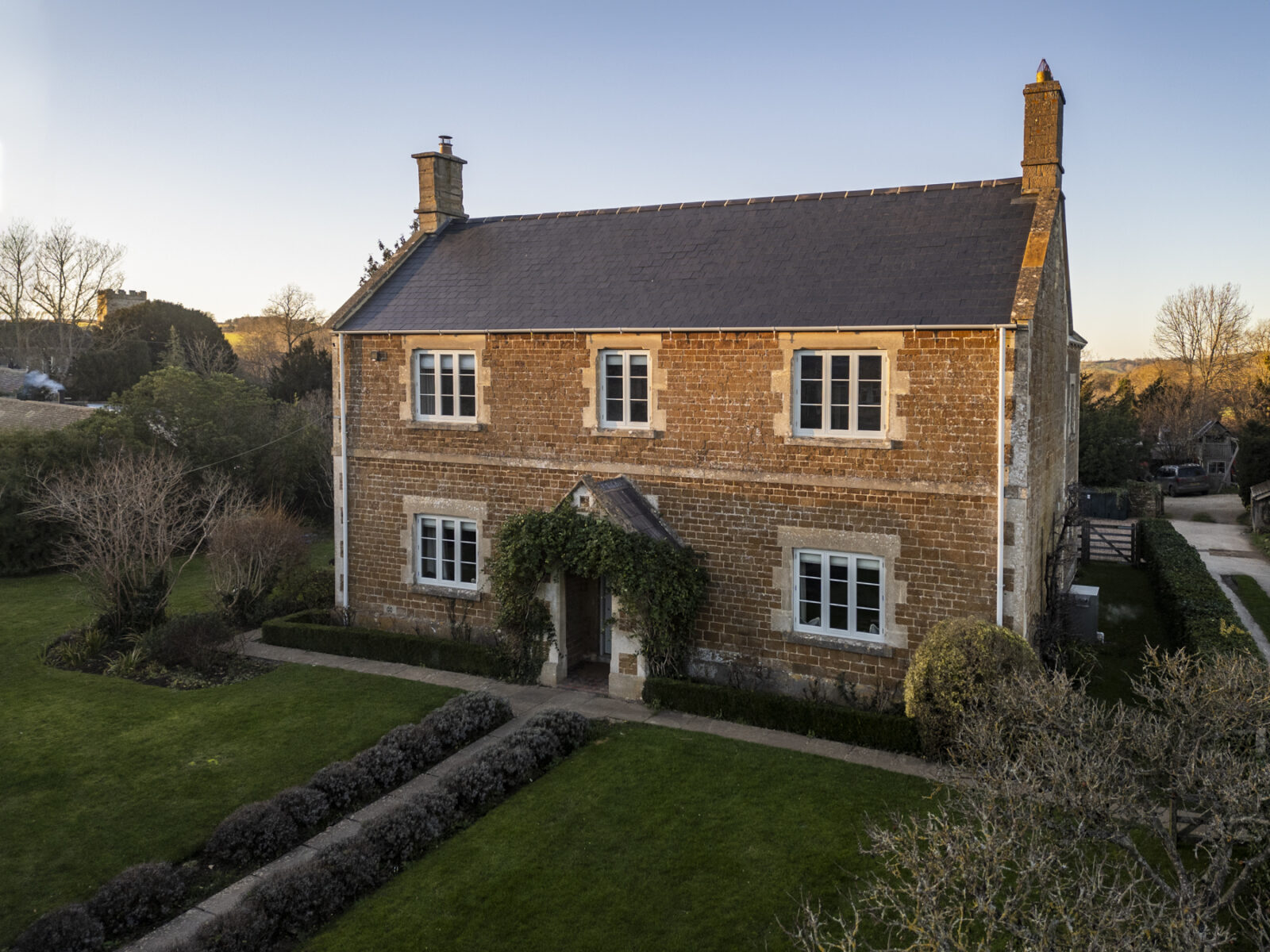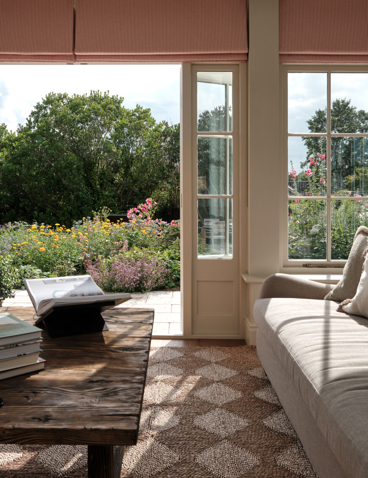 Beyond the honey-hued Cotswolds stone facade awaits a grand entrance hall with statement chequered tiles, enticing you towards the opulent open-plan orangery. Here, you’ll find the central living, kitchen and dining space. Think beautiful bespoke furniture, marble-topped Olaf kitchen cabinets, a dedicated bar space for shaking up cocktails, and a walk-in larder from your wildest dreams. A large farmhouse-style dining table takes centre stage for gathering and feasting, perfect for celebratory soirees and family get-togethers. Zip down the cosy red ticking stripe blinds that wrap their way around the room, to transform the space from day to night.